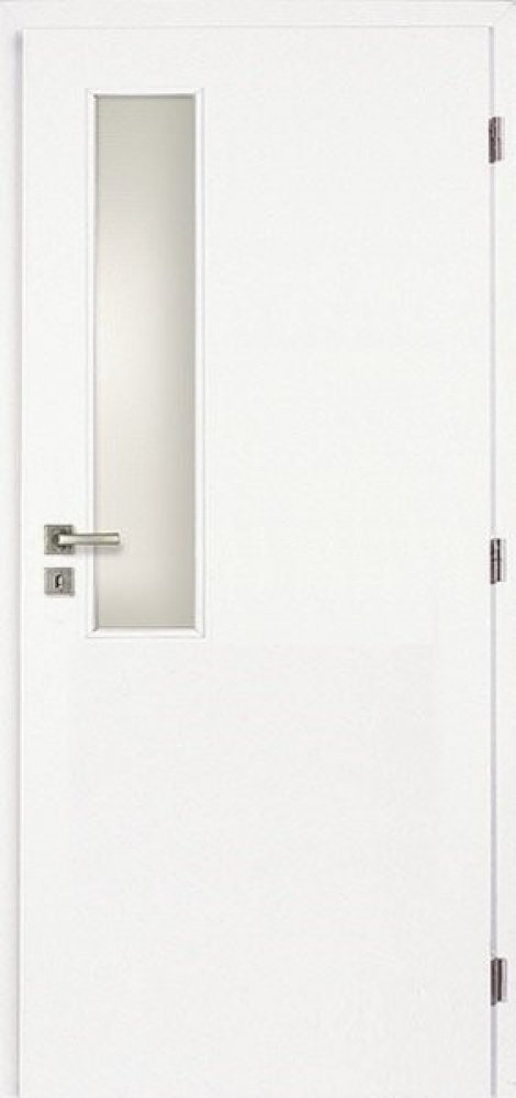 Bílé dveře s proskleným pruhem se satinovaným sklem . Křídla dveří jsou opláštěna HDF lakovanou deskou a jsou standardně osazeny pískovaným sklem. Jako výplň je zde, nejběžněji využívaná, voština. Jedná se o tvrzený papír v několika vrstvách, uspořádaný do tvaru šestiúhelníku - včelí plástev o průměru 25 mm. Interiérové dveře se vyrábějí jak v jednokřídlé, tak i dvoukřídlé variantě, ve standardních šířkách jednokřídlých dveří 60 - 110 cm nebo 125 - 185 cm u dveří dvoukřídlých. Standardní výška dveří je 197 cm. Nezapomeňte si ke svým dveřím vybrat odpovídající obložkové zárubně.
