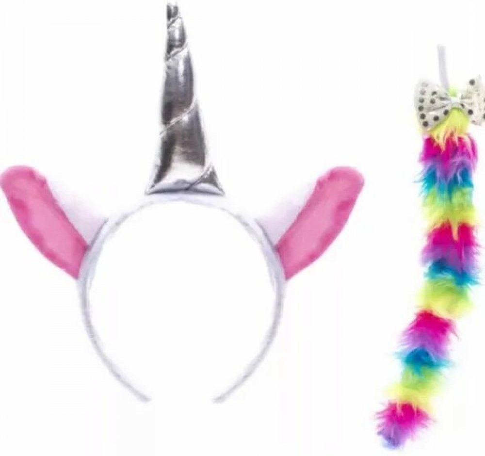 Balíček obsahuje čelenku jednorožce ozdobenou stříbrným rohem a růžovými oušky. Barevný, měkký ocásek je v duhových barvách a rozkošná mašle ho skvěle doplňuje. Doplněk je snadno použitelný a pohodlný na nošení.