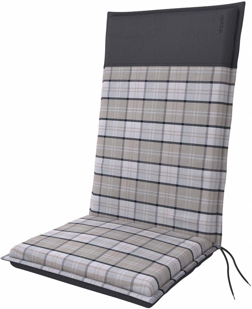 Zahradní polstr Doppler Casa 4401K na křeslo a židli s vysokou opěrkou má moderní look v kostkovaném desénu ve kterém jsou zastoupeny barvy béžová a antracit. Polstr je v provedení s obšitým lemem. Uchycení polstru je pomocí nastavitelného rypsu z pevné tkaniny se sponou za opěrkou a dvou tkaniček v ohybu polstru.
