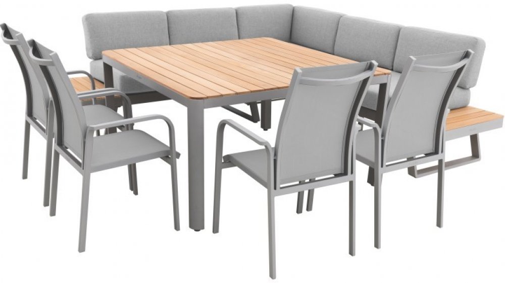 EXPERT PLUS AVERSA TEAK - 7-dílná hliníková jídelní soupravaObjevte kouzlo pohodlí s jídelní soupravou Expert Plus Aversa Teak. Tato elegantní souprava kombinuje moderní design a praktické funkce, které zaručují maximální pohodlí a styl.Naše sedmidílná jídelní souprava Expert Plus Aversa Teak se pyšní hliníkovou konstrukcí, která je odolná a lehká, což ji činí ideální pro venkovní použití. Sestava obsahuje rohovou pohovku, skládající se z 2-místné a 3-místné části, přičemž 3-místná pohovka nabízí možnost polohování v 5 různých pozicích, což ji promění na pohodlné lehátko. Elegantní odkládací plochy, vyrobené z teakových latí, dodávají soupravě přírodní šarm a praktickou funkčnost.Sedáky a opěrné polštáře jsou vyrobeny z kvalitního polyesteru a navrženy s důrazem na moderní design. Díky rovně šitým liniím a absenci prošití vypadají velmi elegantně. Potahy jsou opatřeny zipy, což umožňuje snadné sundání a vyprání, a tím usnadňuje údržbu.Stůl je nejen praktický, ale také stylový, s deskou z teakových latí, která dokonale doplňuje celkový vzhled soupravy. Je vybaven regulačními kolečky, které umožňují snadné vyrovnání na nerovném terénu. Součástí sestavy jsou čtyři stohovací židle s rychleschnoucím výpletem odolným vůči povětrnostním vlivům, což zajišťuje maximální pohodlí a snadné uskladnění.Při používání teakového nábytku ve vnějším nechráněném prostředí doporučujeme jeho pravidelnou údržbu, aby Vám nábytek zůstal dlouho krásný a nepoškozený. V sekci manuály si můžete stáhnout náš návod na údržbu teakového dřeva.Informace o produktu:Pohovkalehká a odolná hliníková konstrukcepohodlná a vysoká výplňsnímatelný potahbezúdržbové, dlouhá životnostOdkládací plochy z teakových latírozměry 3místné lavice: 242 x 78 x 75 cm (šířka x hloubka x výška)rozměry 2místné lavice: 164 x 78 x 75 cm (šířka x hloubka x výška)Křeslastohovacívýplet z rychleschnoucí syntetické tkaninyodolné vůči povětrnostním vlivůmrozměry křesla: 56 x 65 x 98 cm (šířka x hloubka x výška)Stůl pevná hliníková konstrukcedeska stolu z teakových latíbezúdržbové, dlouhá životnostregulační kolečka pro vyrovnání terénních nerovnostírozměry: 135 x 135 x 74 cm (šířka x hloubka x výška)