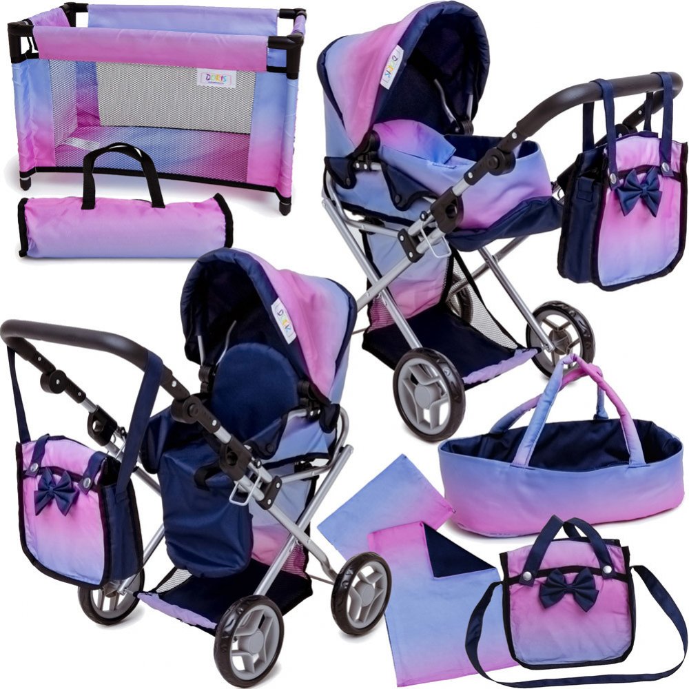 Obsahuje: Kočárek pro panenky kombinovaný, cestovní postýlku, tašku na postýlku, peřinku s polštářkem.