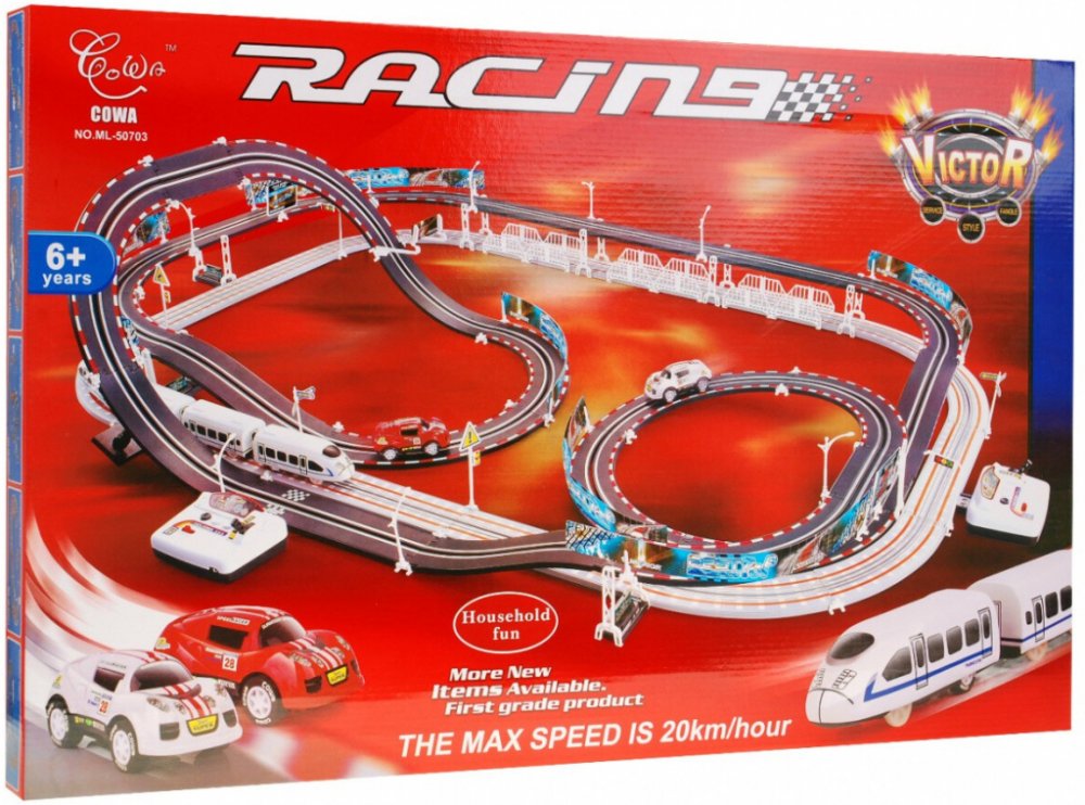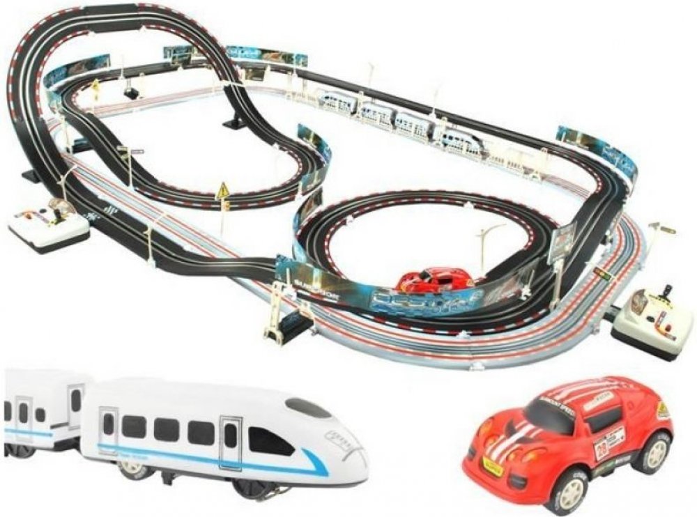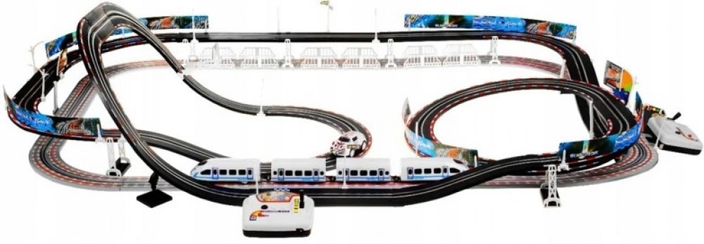 Skvělá dvojitá autodráha / vlačkodráha, po které jezdí zároveň auto i vlak. Obojí je odděleně ovládáno dvěma trafy s možností regulace rychlosti, spuštění turbo jízdy nebo změny směru jízdy. Úžasná hračka pro každého kluka, ale pozor – dvojitá dráha Vám může zabrat celou podlahu v pokojíčku, je totiž obrovská! Celá hračka je velmi kvalitně vyrobena a zabalena do velké krabice, jistě to bude skvělý...