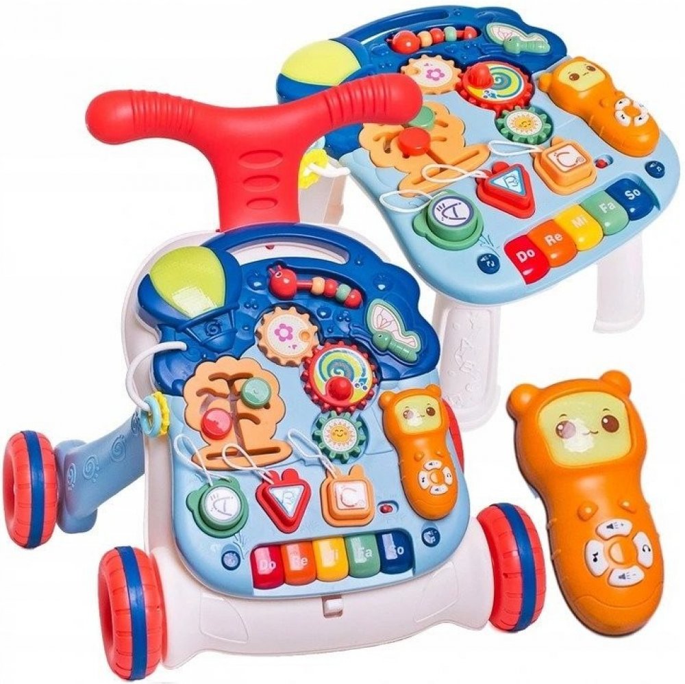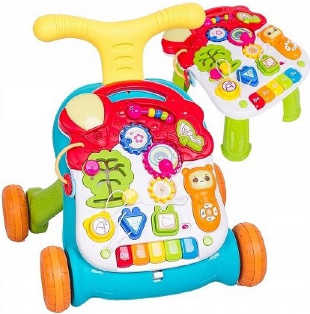 Barevné chodítko s hracím stolečkem. Multifunkční interaktivní hračka, která kombinuje funkci chodítka a vzdělávacího stolu.