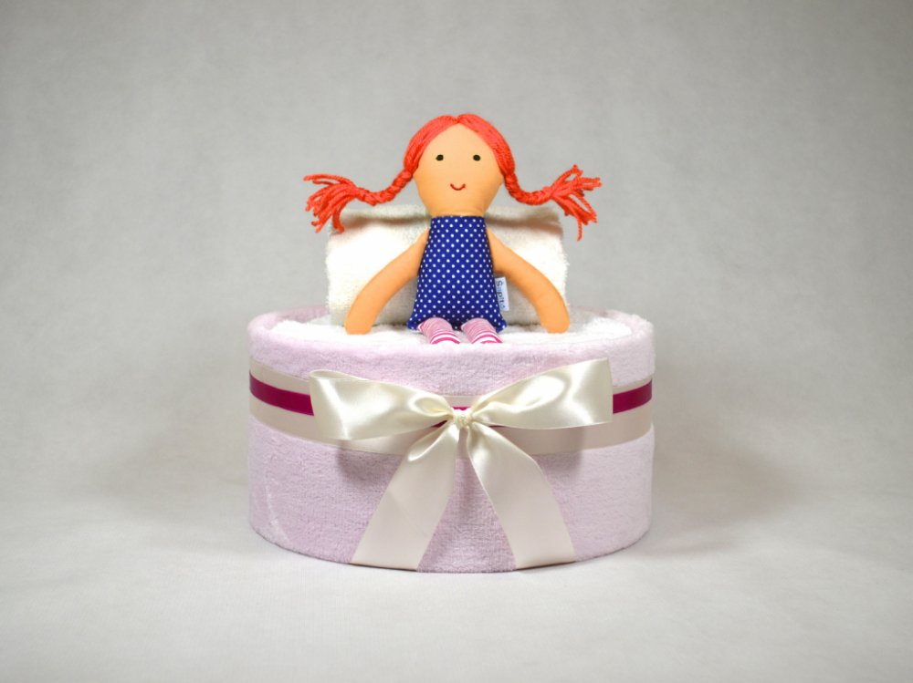 Dort bude ozdobený barevně sladěnými mašlemi a zabalený v celofánu. Dort je vytvořený bez použití špendlíků, dítě může dort rozbalit samo. Průměr...