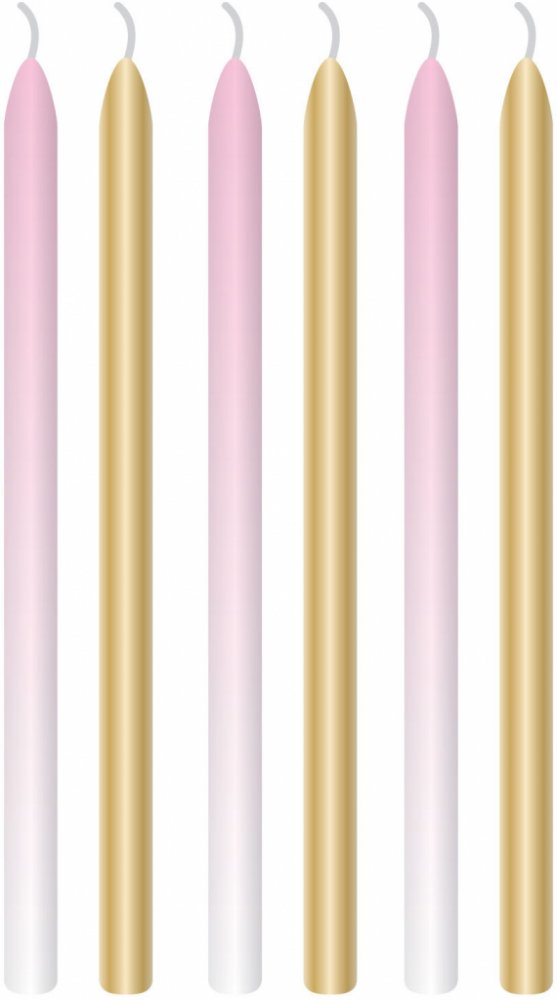 Narozeninový dort by měly vždy zdobit krásné svíčky. Krásné vysoké svíčky na dort mají příjemnou kombinaci v barvách růžové a zlaté a zaručeně ozdobí každý narozeninový dort v jakémkoliv tématu. Výška svíček 12 cm Balení : 6 ks