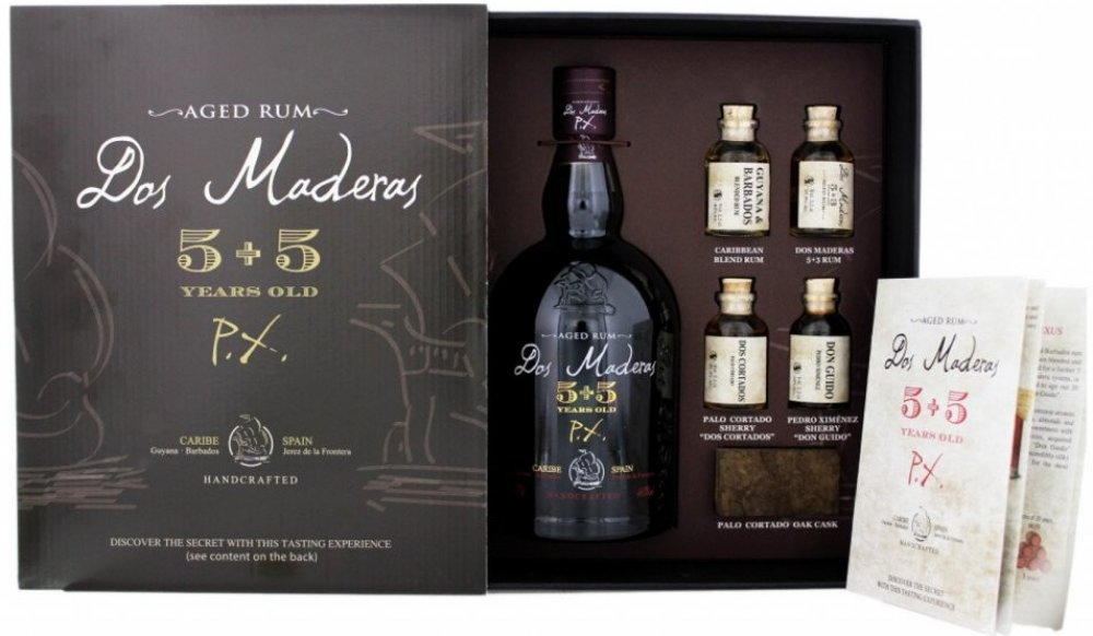 Unikátní balení oblíbeného rumu Dos Maderas 5+5 v dárkové kazetě, ve které kromě rumu samotného najdete 4 miniatury se vzorky rumů tak, jak je čas postupně měnil.#EnterRum Dos Maderas 5+5 PX zraje třífázově. Stejně jako Dos Maderas 5+3 zraje nejdříve v Karibiku v sudech z amerického bílého dubu. Následně je přepraven lodí do španělské Andalusie do vinařství Williams a Humbert ležícího v městě Jerez, kde rum zraje systémem solera další tři roky v sudech po dvacetiletém sherry Dos Cortados. Třetí fází je pak dvouleté zrání v sudech po sherry Don Guido odrůdy Pedro Ximénez, které v těchto sudech zrálo taktéž po dobu 20 let.#Enter Výsledkem je mimořádný a unikátní rum jantarové barvy a delikátní chuti, ze které jsou cítit hrozinky, fíky a vanilka. Díky zvolenému způsobu zrání je tento rum vhodnou alternativou cognaců a brandy.