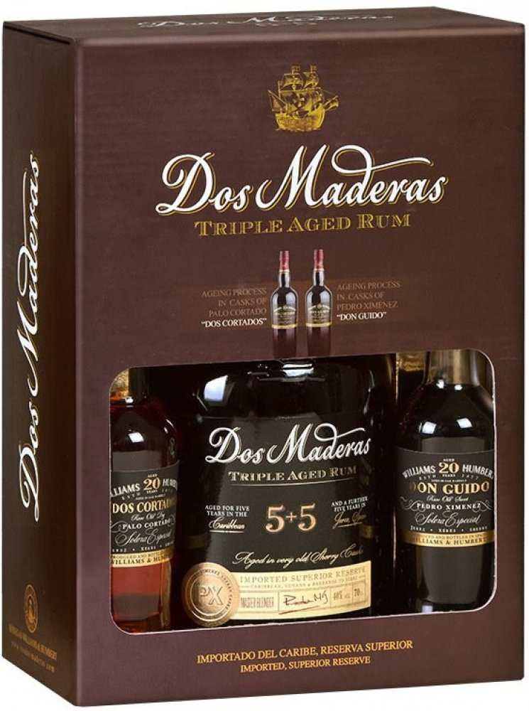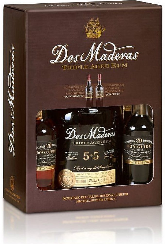 Rum Dos Maderas P.X. 5+5yo 0,7l se Sherry Don Guido 20yo 0,1l a Sherry Dos Cortados 20yo 0,1l v krásné dárkové kazetě.