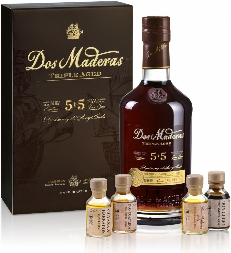 Tento degustační set obsahuje Dos Maderas (5+5) 0,7 l, Palo Cortado "Dos Cortados" Sherry 0,02 l, Blend of Barbados & Guyana Rum 0,02 l, Don Guido Pedro Ximénez Sherry 0,02 l, Dos Maderas 5+3 0,02 l.