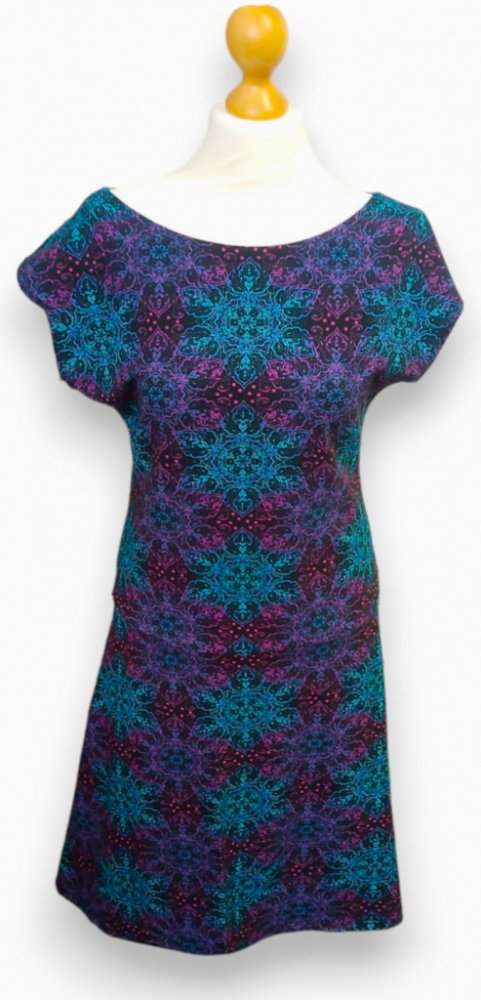 Dámské šaty s přinechaným rukávem a čtvrtkolovou sukní. Tento střih sluší i silnějším postavám, díky přinechanému rukávu šaty "větrají". V chladnějším období je lze nosit na tričko s dlouhým rukávem. Ideální kousek, který využijete po celý rok.