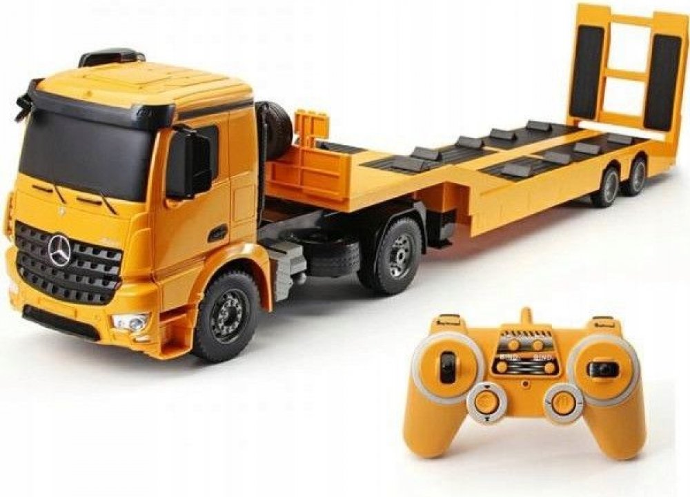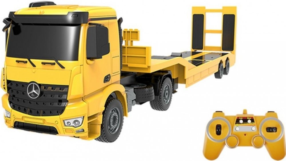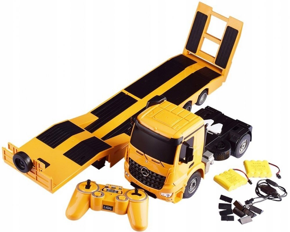 - Dálkové ovládání: Model je vybaven 2.4GHz dálkovým ovládáním, které zajišťuje plynulé a bezproblémové řízení. S tímto ovladačem můžete kontrolovat pohyb kamionu, zvedání a spouštění rampy pro nakládání aut.