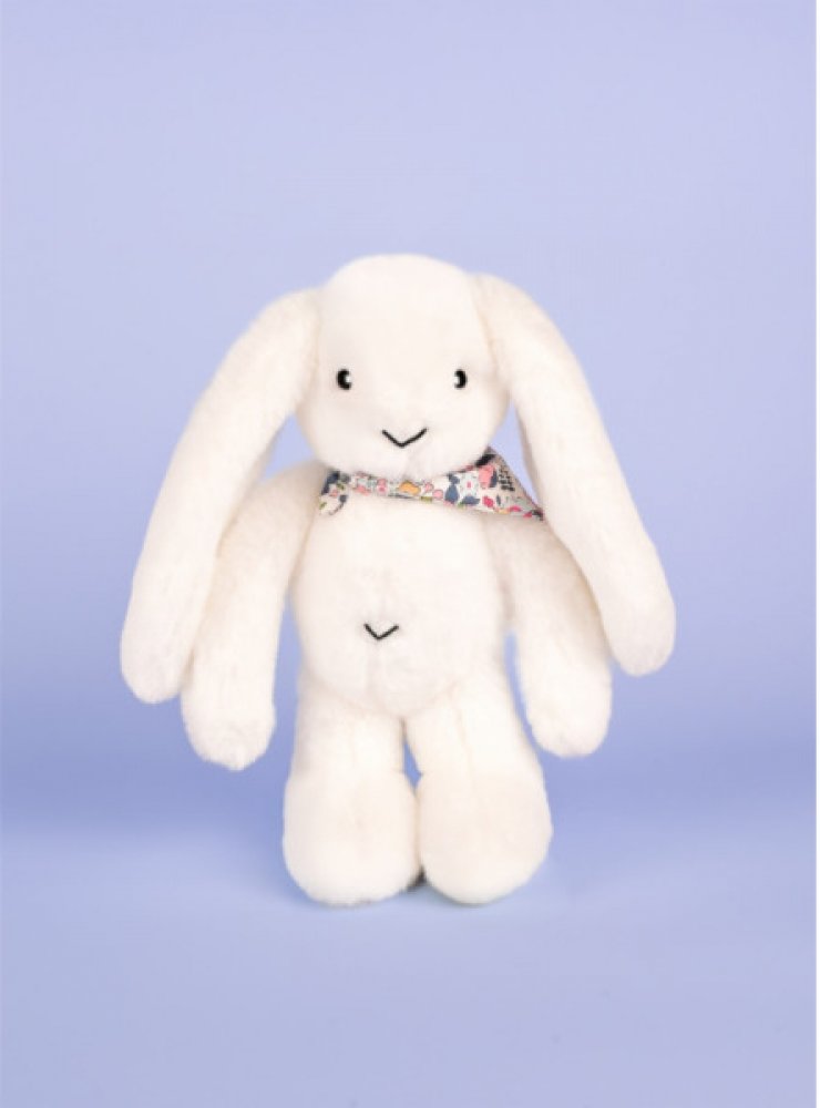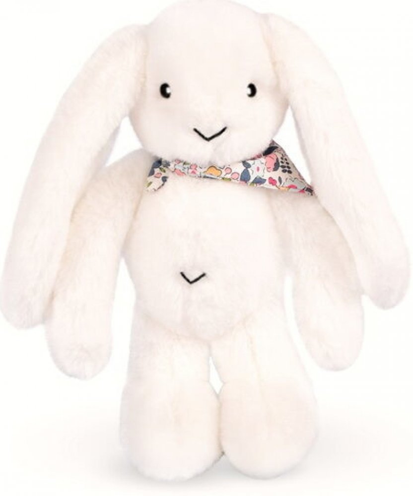 Heboučký bílý zajíček o velikosti 35 cm s květinovou šátkem má přátelskou tvář, dlouhé uši a doprovází miminko od narození po celé dětství, aby mu přinesl pocit pohodlí a bezpečí. Díky barevnému provedení v jemných barvách a prémiovému hebkému materiálu nabádá k tulení a mačkání a dítě zabaví i uklidní.