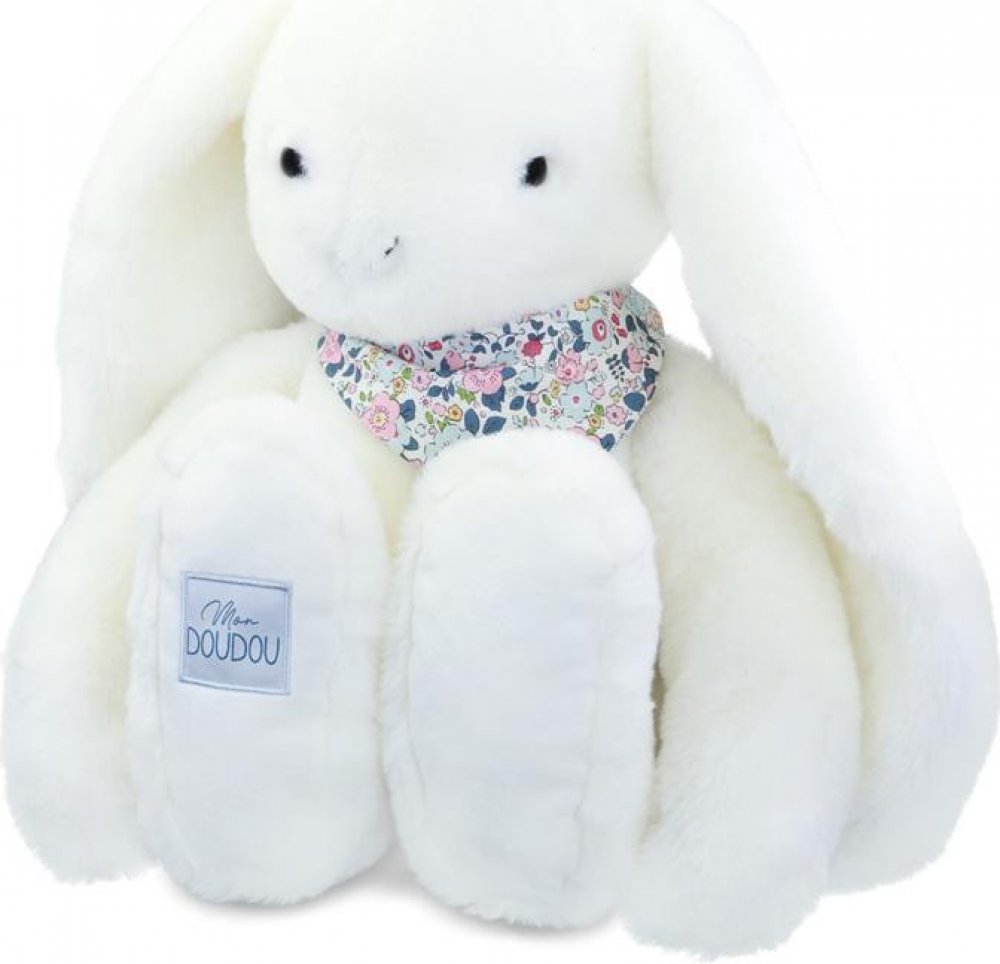 Heboučký králík o velikosti 50 cm s květovaným šátkem má přátelskou tvář, dlouhé uši a doprovází miminko od narození po celé dětství, aby mu poskytl objetí, pocit pohodlí a bezpečí. Díky barevnému provedení v jemných barvách a prémiovému extra hebkému materiálu nabádá k tulení a muchlání a dítě zabaví i uklidní.