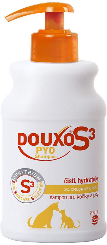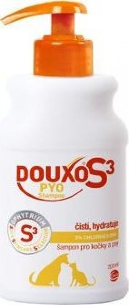 Podpora léčby topických zánětlivých onemocnění kůže. Čistí kůži a díky působení 3% chlorhexidin diglukonátu snižuje mikrobiální zátěž. Zanechává srst jemnou a lesklou, restrukturalizuje a ulehčuje její rozčesávání. Pro pravidelný a dlouhodobý kontakt s ophytriem a chlorhexidin diglukonáten používejte DOUXO S3 PYO pěnu.