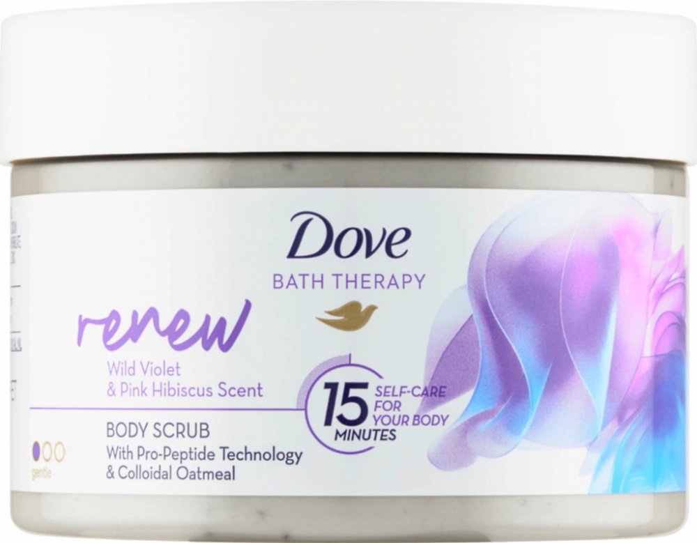 Dove tělový peeling Renew s vůní fialky a růžového ibišku odstraňuje odumřelé buňky pokožky pomocí částic písku a zároveň o ni pečuje pomocí Pro-Peptidové technologie. Nejenže šetrně zjemňuje pokožku, ale zároveň ji čistí a odstraňuje nečistoty. Obsahuje koloidní oves, která je známá svými hydratačními a zklidňujícími účinky. Dopřejte svému tělu 15 minutovou péči s tělovým peelingem.
