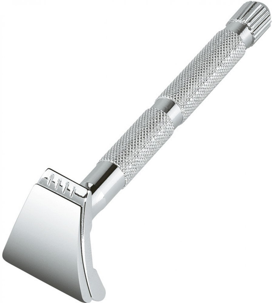 Holicí strojek MERKUR Solingen ve speciálním provedení pro úpravu vousů a kníru. Strojek vloženou žiletku pevně sevře a mírně zkroutí, čímž dojde ke zpevnění žiletky a žiletka lépe a déle holí. Strojek je kovový a chromovaný připravený pro speciální žiletky Dovo Solingen. Šroubovací držadlo.