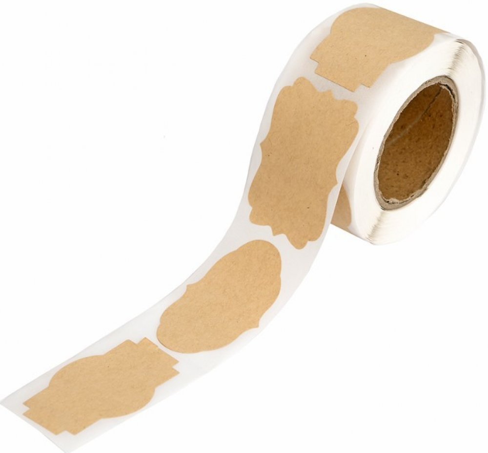 Samolepky na roli ve formě stylizovaných cedulí v přírodní kraftové barvě.