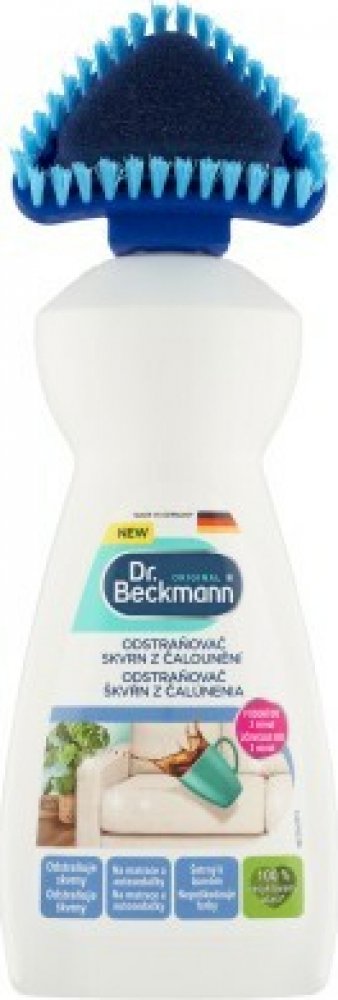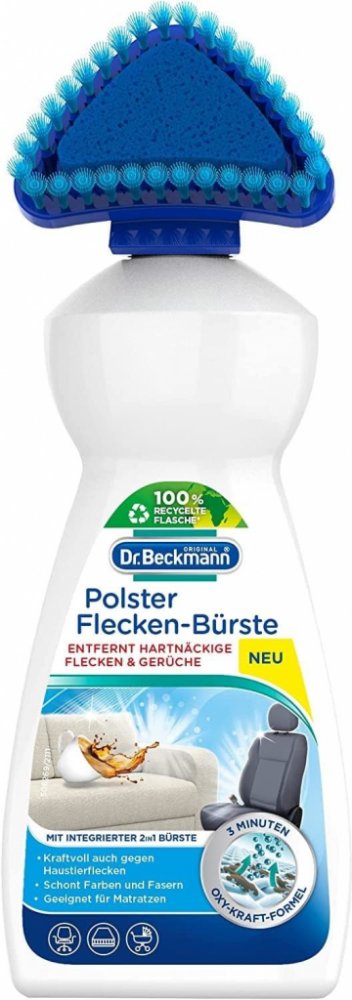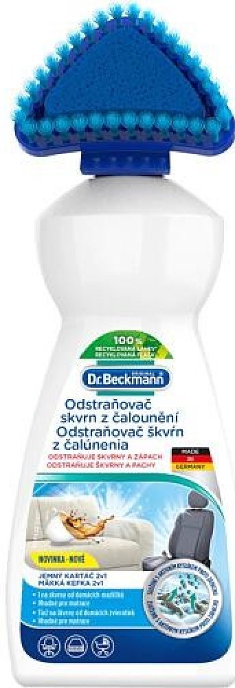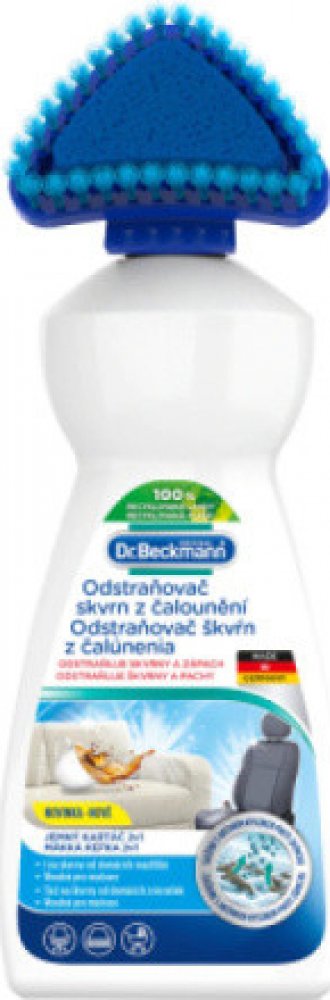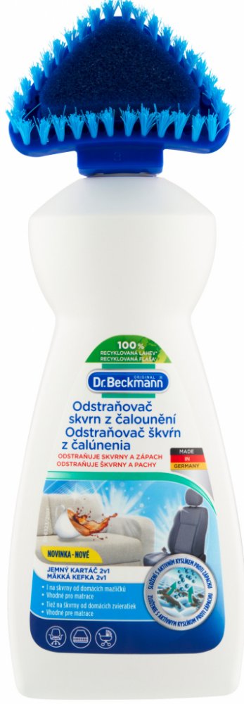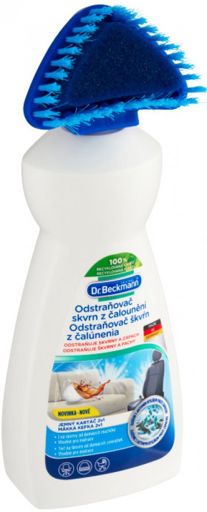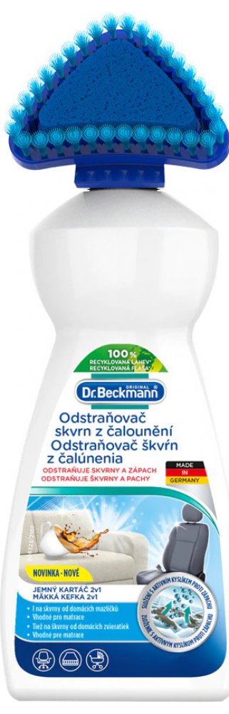 Čisticí prostředek od značky Dr. Beckmann pro efektivní odstraňování skvrn a zápachu z pohovek, autosedaček, matrací a mnoha dalších. Patentovaná technologie Freshplex pohlcuje zápach. Kartáčový aplikátor pomáhá optimálně aplikovat přípravek, který obsahuje aktivní kyslík a je tedy velmi účinný na odolné skvrny. Odstraňuje odolné skvrny a pachy již za 3 minuty – složení Oxy-Power Silná čisticí receptura s aktivním kyslíkem Kartáčový aplikátor umožní přípravek důkladně zapracovat do skvrny – 2v1 tvar Patentovaná technologie Freshplex proti zápachu Účinný proti skvrnám od zvířat Chrání barvy a vlákna Použití na pohovky, autosedačky, kočárky, matrace apod. Snadno biologicky odbouratelné složení bez chlorového bělidla Dermatologicky testováno Bezpečnostní list ke stažení Složení: 5% aniontové povrchově aktivní látky, bělidlo na bázi kyslíku, neiontové povrchově aktivní látky. BENZOÁT SODNÝ, Vůně. Použití: Před prvním použitím odšroubujte hlavici kartáčku. Propíchněte těsnění velikosti špendlíkové hlavičky (cca 2 mm) a hlavici kartáčku opět odšroubujte (neutahujte příliš). Odstraňte volné, překrývající nečistoty. Držte lahvičku dolů a jemně stiskněte, abyste namočili aplikační houbičku. Aplikujte přípravek (potah úplně nenamočte), jemně zapracujte do látky. Nechte působit 3 minuty. Produkt a zbytky skvrn zcela otřete vlhkým hadříkem světlé barvy. V případě potřeby postup zopakujte. Po každém použití aplikátor opláchněte. Upozornění: Držte mimo dosah dětí. Barevnou stálost a trvanlivost předem otestujte na nenápadné ploše. Vždy dodržujte pokyny uvedené na štítku ošetřovaného materiálu. Nevhodné na hedvábí, samet, kůži a tkaniny citlivé na vodu. Láhev skladujte ve svislé poloze. Uchovávejte čistič a obal mimo dosah domácích zvířat. Vaše domácí zvíře by nemělo být ve stejné místnosti, když používáte výrobek. Majitelé ptáků: Během a po použití místnost dobře větrejte.