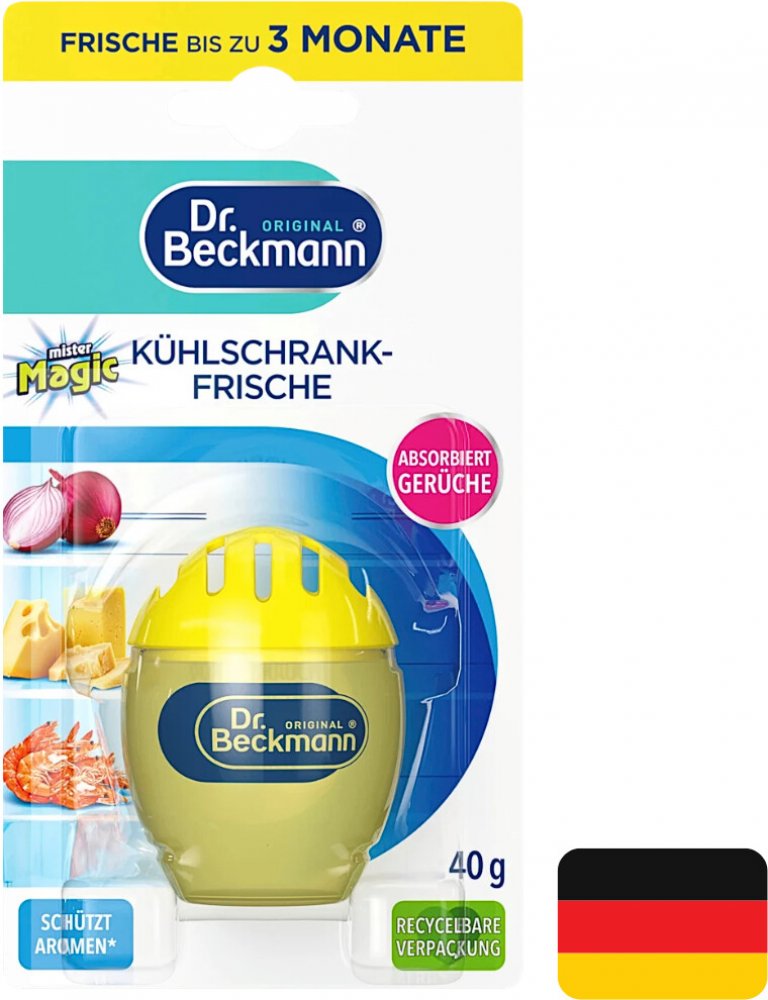 Německý Dr. Beckmann pohlcovač pachů do lednice 40 g pohlcuje nepříjemné pachy v chladničce způsobené samotným jídlem nebo nesprávným skladováním, které jsou nejen nepříjemné, ale mohou ovlivnit i chuť jiných potravin. S vysokou účinností pohlcuje veškeré vůně a nežádoucí pachy v chladničkách, mrazicích boxech, spižírnách a jinde. Ve vzduchu se nacházející částečky zápachu budou díky gelovému složení pohlcovače rychle navázány a zredukovány a to až na 90 dní. Dr. Beckmann Kühlschrank-Frische rychle a bezpečně absorbuje nepříjemné pachy v chladničce, které mohou být způsobeny potravinami (např. ryby, sýry, cibule). Gelová formule bez zápachu filtruje částice vyvíjející zápach ve vzduchu a váže je jako houba.• Neutralizuje nepříjemné pachy• Zachovává přirozenou chuť jídla• Rychle a bezpečně absorbuje nepříjemné pachy• Šetří místo, možno uložit v držáku vajec• Funguje minimálně 3 měsícePOUŽITÍ:1. Sejměte víko a odstraňte ochrannou fólii. 2. Vraťte zpět víko a vložte vajíčko do chladničky. 3. Jakmile gel ustoupí pod značku, vyměňte produkt za nové vejce.SLOŽENÍ:viz Inhaltsstoffe/Ingredients na obalu.DOVOZ:Německo.UPOZORNĚNÍ:Zamezte styku s očima, při zasažení vypláchněte.ŽIVOTNÍ PROSTŘEDÍ:Zcela prázdné a čistý obaly je možné recyklovat.