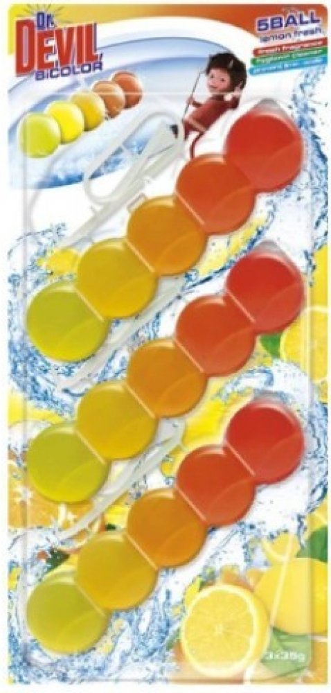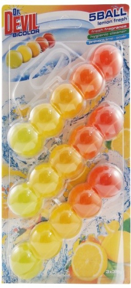 Dr. DEVIL BiCOLOR Lemon fresh 3 x 35 gDr. DEVIL BiCOLOR 5Ball WC závěs Lemon Fresh 3 × 35 g je výhodné trojbalení závěsných WC bloků, které zajistí dlouhodobou čistotu a svěžest vaší toalety s osvěžující citronovou vůní.Hlavní vlastnosti:- Intenzivní citronová vůně, která neutralizuje nepříjemné pachy- Čistí při každém spláchnutí a zanechává mísu hygienicky čistou- Bohatě pění a působí proti usazo...