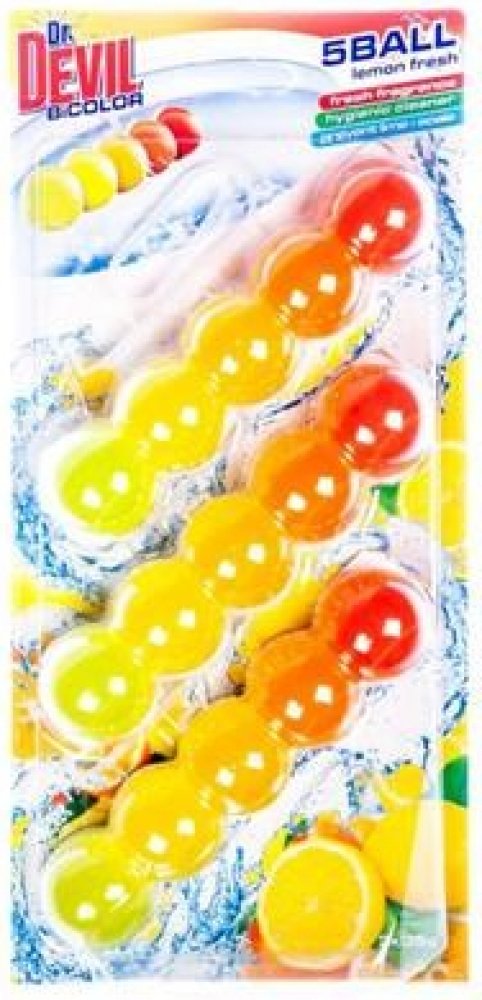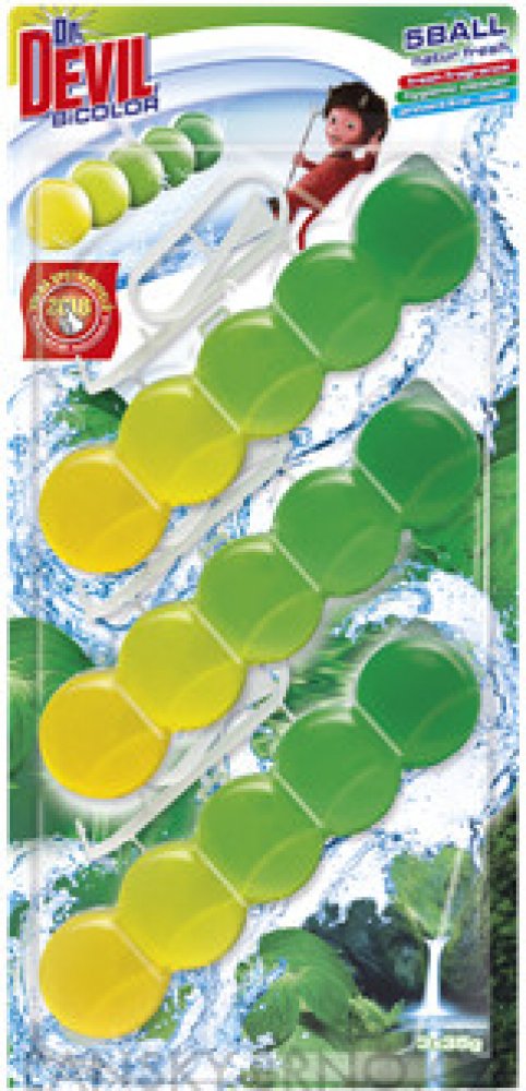 Dr. Devil WC BiCOLOR 5BALL voní, čistí a preventivně působí proti usazování vodního kamene. NEBEZPEČÍ Dráždí kůži. Způsobuje vážné poškození očí. Škodlivý pro vodní organismy, s dlouhodobými účinky. Obsahuje dipentene, citral, pin-2(10)-ene, benzisothiazolinone. Může vyvolat alergickou reakci.