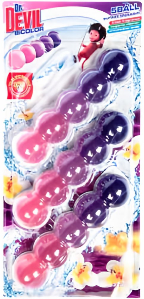 Dr. Devil WC BiCOLOR 5BALL voní, čistí a preventivně působí proti usazování vodního kamene.Standardní věty o nebezpečnostiH315 Dráždí kůži.H318 Způsobuje vážné poškození očí.H412 Škodlivý pro vodní organismy, s dlouhodobými účinky.Pokyny pro bezpečné zacházeníP101 Je-li nutná lékařská pomoc, mějte po ruce obal nebo štítek výrobku.P102 Uchovávejte mimo dosah dětí.P280 Používejte ochranné rukavice/ochranné brýle.P305+P351+P338 PŘI ZASAŽENÍ OČÍ: Několik minut opatrně vyplachujte vodou. Vyjměte kontaktníčočky, jsou-li nasazeny a pokud je lze vyjmout snadno. Pokračujte ve vyplachování.P310 Okamžitě volejte TOXIKOLOGICKÉ INFORMAČNÍ STŘEDISKO/lékaře.P501 Odstraňte zcela vyprázdněný obal v místě sběru recyklovatelného/komunálníhoodpadu.