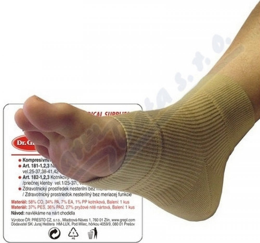 Kotníková kompresivní bandáž celkově zpevňuje stavbu chodidla směrem od kotníku k prstům. Produkt fixuje volné vazy, svaly, záprstní a nártní kosti a podepírá také současně i příčnou klenbu při problémech tzv.ploché nohy, dále zpevňuje rozevřené prsty i volnější klouby chodidla. Kotníková bandáž je určena pro osoby s vel. 38-41.