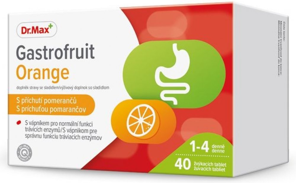 Uhličitan vápenatý Pro normální trávení Dr.Max Gastrofruit obsahuje 500 mg uhličitanu vápenatého (odpovídá 200 mg vápníku). Vápník přispívá k normálnímu fungování trávicích enzymů. Trávicí enzymy jsou bílkoviny, které umožňují rozklad potravy na jednodušší stavební celky. Složení: Každá tableta obsahuje Hmot./1 tbl. % DDD* Vápník 200 mg 25 * % doporučené denní dávky v 1 tabletě Složení: Každá tableta obsahuje: plnidlo (sorbitol), uhličitan vápenatý, regulátor kyselosti (kyselina citronová), protihrudkující látka (stearát hořečnatý), maltodextrin. Dále příchuť pomeranč obsahuje: přírodní pomerančové aroma, barvivo (riboflavin), stabilizátor (arabská guma), sladidlo (sukralóza), příchuť citron/limetka: stabilizátor (arabská guma), přírodní citronové aroma, sladidlo (sukralóza), barvivo (riboflavin), přírodní limetkové aroma, příchuť višeň: barvivo (betanin), přírodní višňové aroma, sladidlo (sukralóza), stabilizátor (arabská guma), příchuť černý rybíz: barvivo (bezinkový extrakt), sladidlo (sukralóza), stabilizátor (arabská guma), přírodní aroma černého rybízu. Upozornění: Skladujte v suchu a temnu při teplotě 5–25 °C. Chraňte před vlhkem a přímým slunečním zářením. Nepřekračujte doporučené dávkování. Nadměrná konzumace může vyvolat projímavé účinky. Není určeno jako náhrada pestré stravy. Není určeno pro děti do 12 let. Přípravek mohou v případě potřeby užívat i těhotné a kojící ženy. Ukládejte mimo dosah dětí. Doporučené dávkování: Dospělí podle potřeby až 4 tablety denně. Tablety rozkousejte nebo nechte volně rozplynout v ústech. Balení: 40 tablet Hmotnost obsahu: 60 g (±5%) Výrobce: Dr. Max Pharma Limited, First Floor Roxburghe House, 273-287 Regent Street, London, W1B 2HA, UK Vyrobeno pro síť lékáren Dr.Max.