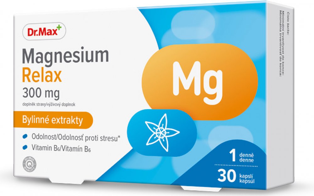 Dr. Max Magnesium Relax obsahuje hořčík a vitamin B6 pro zdravý nervový systém a snížení únavy doplněné bylinnými extrakty meduňky, heřmánku a rozchodnice.