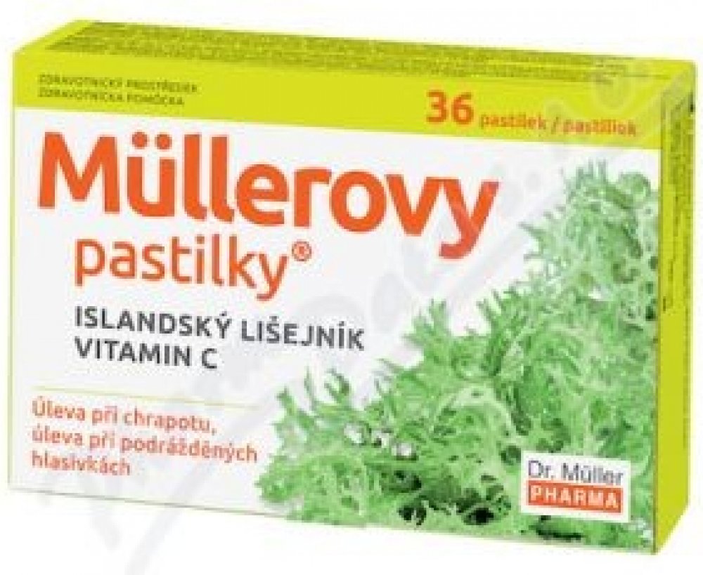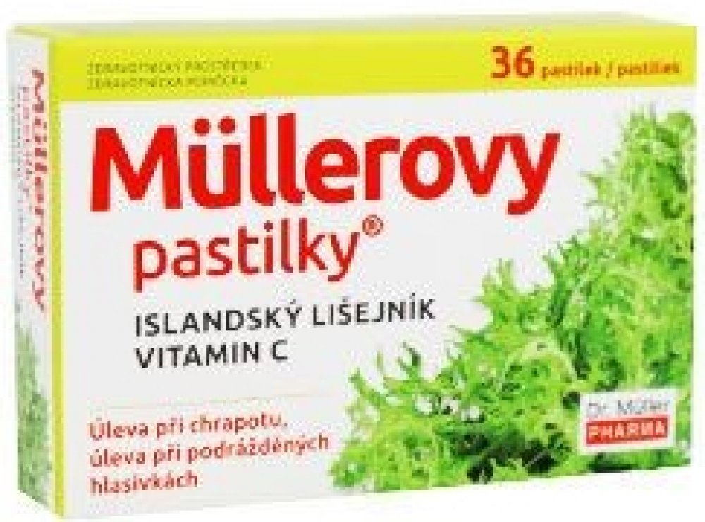 Müllerovy pastilky s islandským lišejníkem jsou zdravotnickým prostředkem, který je určený ke zmírnění příznaků, doprovázejících nachlazení, infekce dutiny ústní, krku nebo horních cest dýchacích. Úleva při zánětlivých procesech v krku a dutině ústní, při suchém a dráždivém kašli, od bolesti v krku, při škrábání v krku a při vykašlávání. Vhodné pro děti od 4 let, těhotné a kojící ženy. Balení obsahuje 36 pastilek. Dávkování a způsob užití Pastilku vložte do úst a nechte volně rozpustit. Pastilku nepolykejte, nekousejte. Každé 2 - 3 hodiny 1 pastilku, dospělí a dospívající až 6 pastilek denně, děti od 4 let až 3 pastilky denně. Složení Sucrose, Hydrolyzed corn starch, Cetraria islandica thallus extract, Honey, Ascorbic acid, Anethole, Menthol, Eucalyptus globulus leaf oil, Maltitol, Potassium sorbate, Aqua, Herbal extract. Upozornění Nepřekračujte doporučené dávkování. Ukládejte mimo dosah dětí. Výrobek není vhodný pro děti do 4 let. Nepoužívejte v případě přecitlivělosti na některou ze složek přípravku. Nepoužívejte po uplynutí doby použitelnosti vyznačené na obalu. Nepoužívejte, pokud je obal porušený.