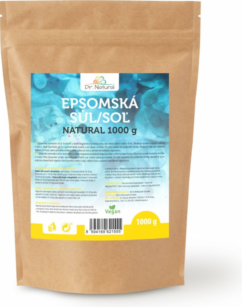 Epsomská sůl Dr. Natural 1000 g, známá také jako hořká sůl, je přírodní zdroj hořčíku a síranu. Má univerzální využití – můžete ji použít pro přípravu relaxačních koupelí, které uvolňují svaly a podporují detoxikaci organismu, nebo vnitřně jako prostředek pro podporu trávení. Díky své čistotě a kvalitě je vhodná i pro wellness péči.