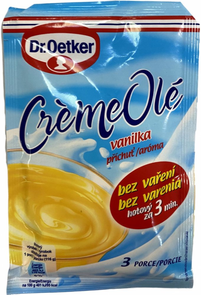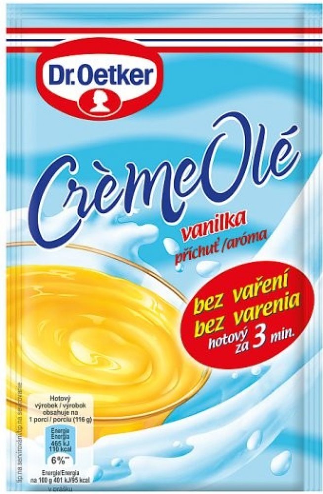 Bez vaření, Hotový za 3 min., Dokonale krémový s rychlou přípravou. To je Crème Olé. Nenahraditelný při použití do Hrk-Hrk receptů a oblíbený jako dezert pro jakoukoliv příležitost., Směs pro přípravu krémového dezertu s vanilkovou příchutí v prášku na 300 ml polotučného mléka.,