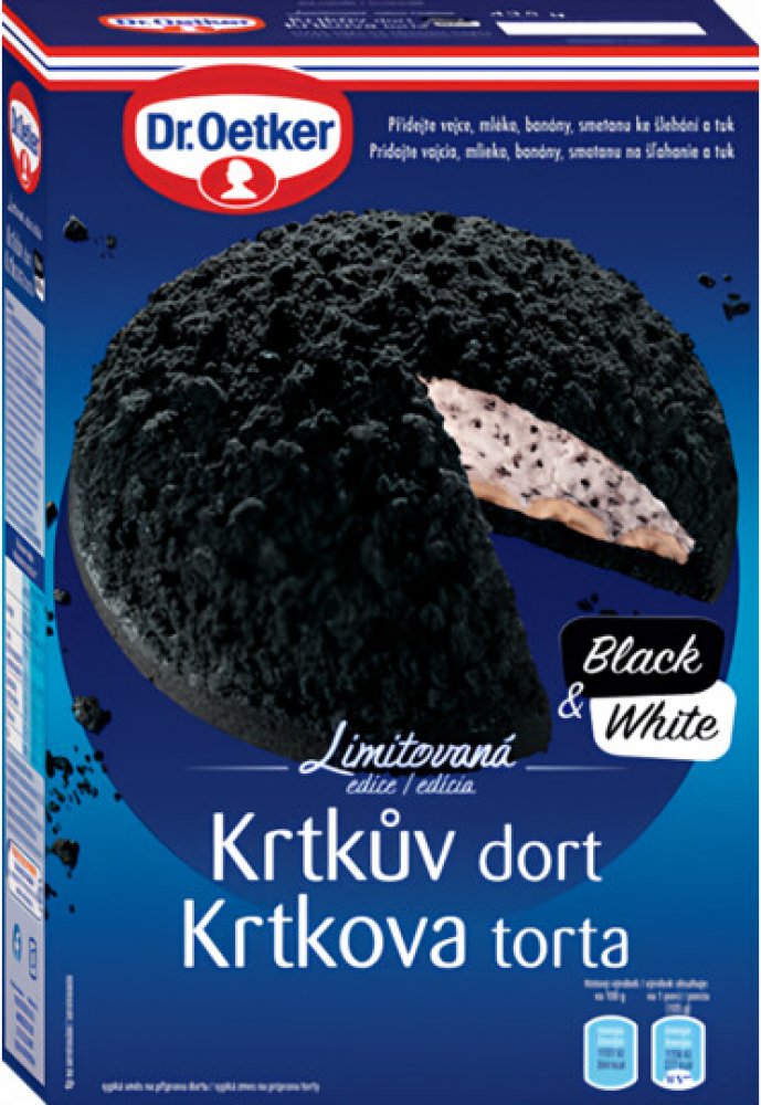 -- Krtkův dort v černém trendy provedení. Exkluzivní limitovaná edice Krtkova dortu s intenzivním černám kakaem, bez přidaných barviv.