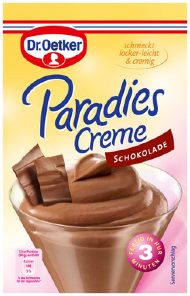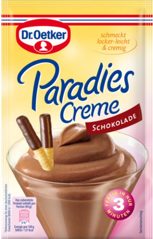 Dr.Oetker Paradies Creme Schokolade chutná a je ideálním dezertem pro celou rodinu.Neodmyslitelně lehký, krémový dezert pro každý den.Stačí dát do 300 ml studeného mléka, šlehat tři minuty a je připraven k jídlu!Opravdu nebeské potěšení.V této chvíli připomínáme spotřebitelům alergie nebo nesnášenlivost, že tento výrobek legálněobsahuje složky podléhající označování nebo může obsahovat stopy alerg...