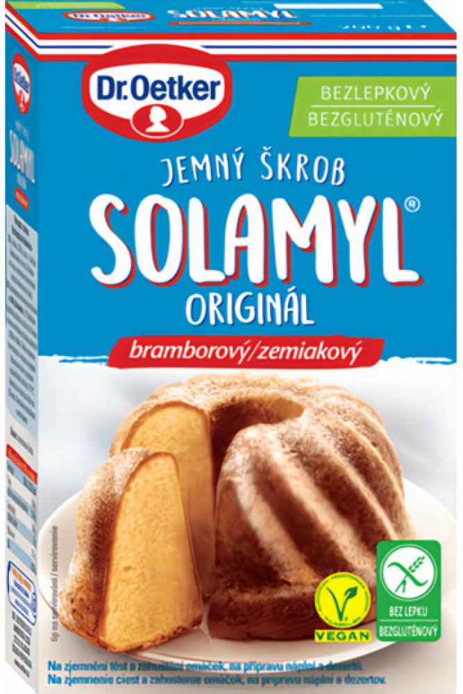 -- Prvotřídní jmný bramborový škrob Dr. Oetker Solamyl.Osvědčená kvalita, univerzální použití.Na zjemnění test, zahuštní omáček, přípravu náplní a dezertů i pro asijskou kuchyni. Díky důkladnému výběru kvalitních surovin a pečliv kontrole našeho výrobního procesu Vám garantujeme kvalitní jemný bramborový škrob Solamyl jako bezlepkový a vhodný i pro vegany. Originál je jen den.ZJEMNĚNÍ TĚSTANa zjem...