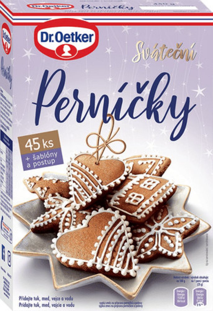 Cena se může v jednotlivých regionech lišit. -- Oblíbená sypká směs na přípravu voňavých perníčků a polevy. Kompletní řešení pro přípravu tradičních vánočních perníčků i cukrové polevy. Stačí přidat máslo, med a vejce. Balení vystačí na přípravu 45-50 ks perníčků (2 plechy). Na vnitřní straně obalu je pro inspiraci šablona pro vystřihnutí Mikuláše, čerta a vánočních ozdob. O výrobci Rodinná společnost Dr. Oetker nabízí nejrozmanitější dezerty v prášku, sladká a slaná jídla v prášku nebo práškové nápoje z prověřených a originálních receptur. Protože je v tuzemsku oblíbený, svůj sortiment neustále rozšiřuje. Cílem značky je vyrábět pokrmy s maximální péčí a z výhradně kvalitních surovin, aby byla zaručena kvalita a bezpečnost výrobků.