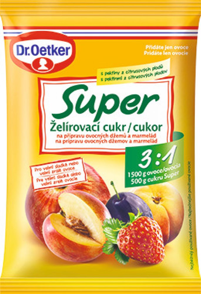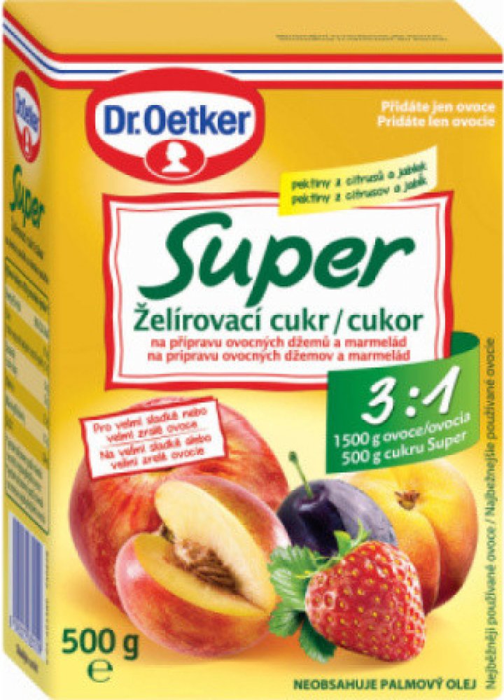 NÁVOD K POUŽITÍ Použití: 1. Očištěné a vypeckované ovoce nakrájíme na velmi malé kousky nebo rozemeleme. 2. Odvážíme 1500 g ovoce a dáme do většího hrnce. Přidáme Super želírovací cukr a dobře promícháme. 3. Vše za stálého míchání přivedeme do varu a důkladně povaříme minimálně 5 minut. Odebereme případnou pěnu a ihned plníme do připravených sklenic. 4. Sklenice uzavřeme pečlivě víčkem a otočíme dnem vzhůru asi na 5 minut. Tip: Na talířek kápneme 1-2 lžičky horkého džemu. Pokud je džem po vychladnutí málo tuhý, vmícháme do něj 2 lžičky Kyseliny citrónové Dr.Oetker.