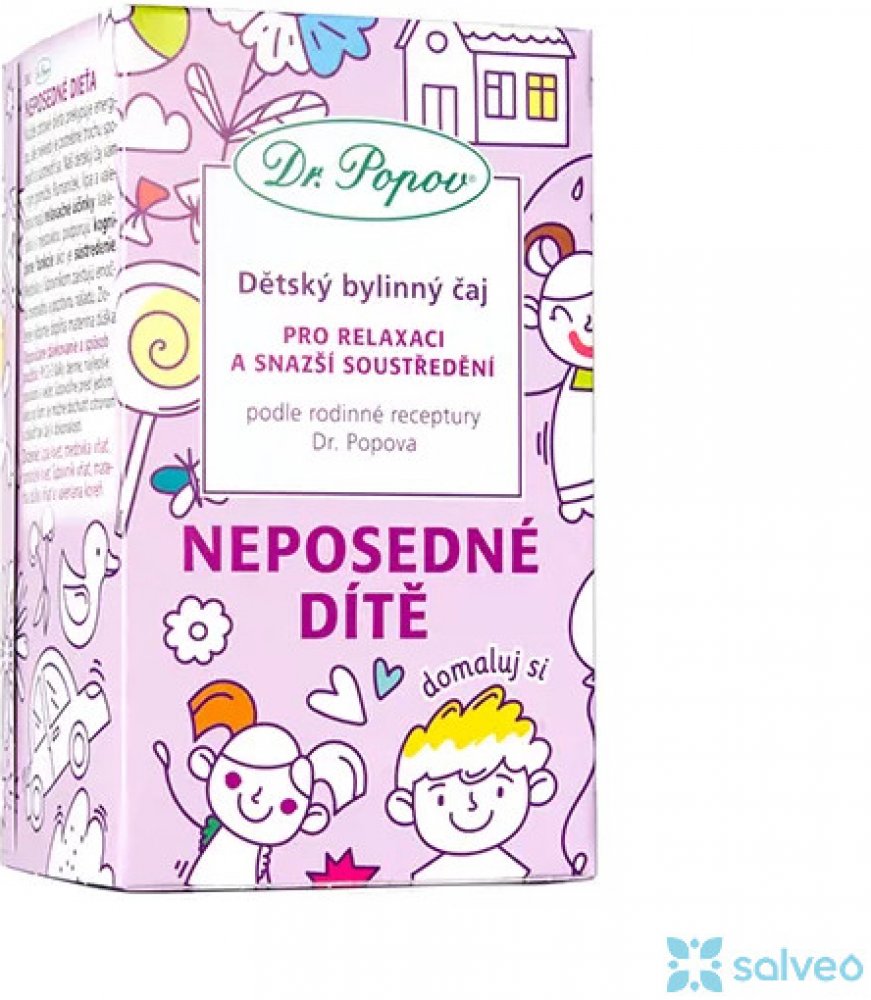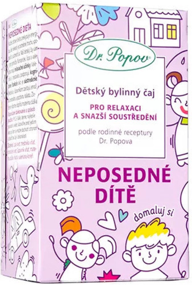 Dr. Popov Neposedné dítě dětský byliný čaj 20 x 1.5 g Každé zdravé dítě překypuje energií, ale někdy je potřeba trochu zpomalit a soustředit se. Náš dětský čaj vám s tím pomůže. Heřmánek, lípa a kozlík mají relaxační účinky. Kozlík s meduňkou podporují kognitivní funkce jako je soustředění. Meduňka s třezalkou zajistí emoční rovnováhu a pozitivní náladu. Složení výborně doplňuje mateřídouška. Bylinky příznivě působí na nervovou soustavu, přecitlivělost, podrážděnost, neklid, apod. Vaše děti budou mít radost nejen z obsahu, ale také z obalu. Na krabičce jsou om