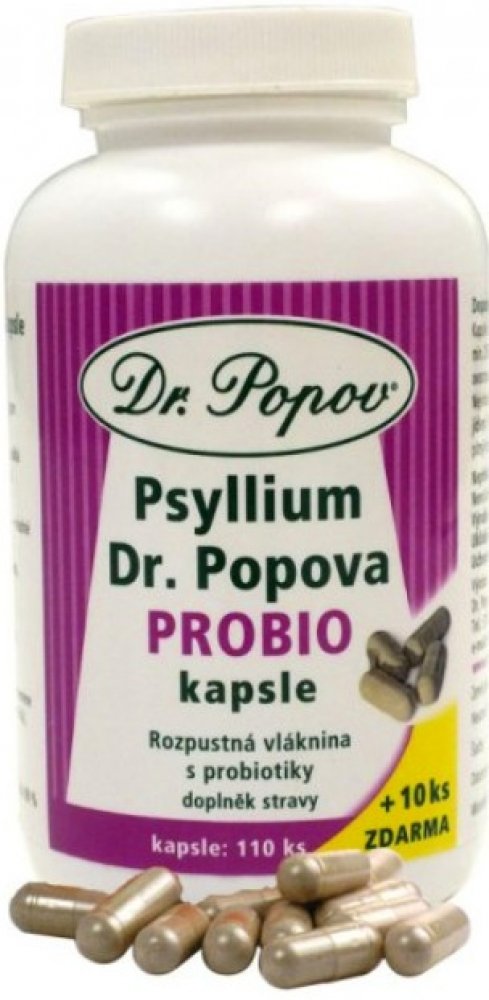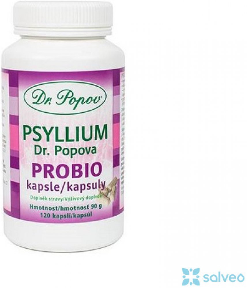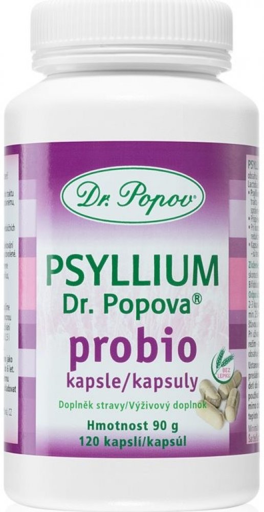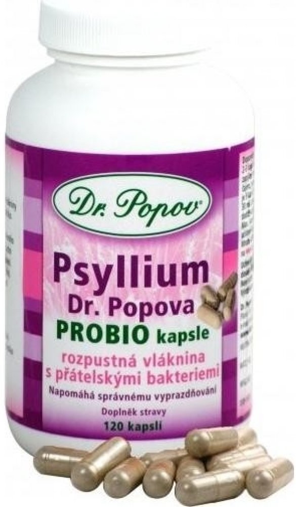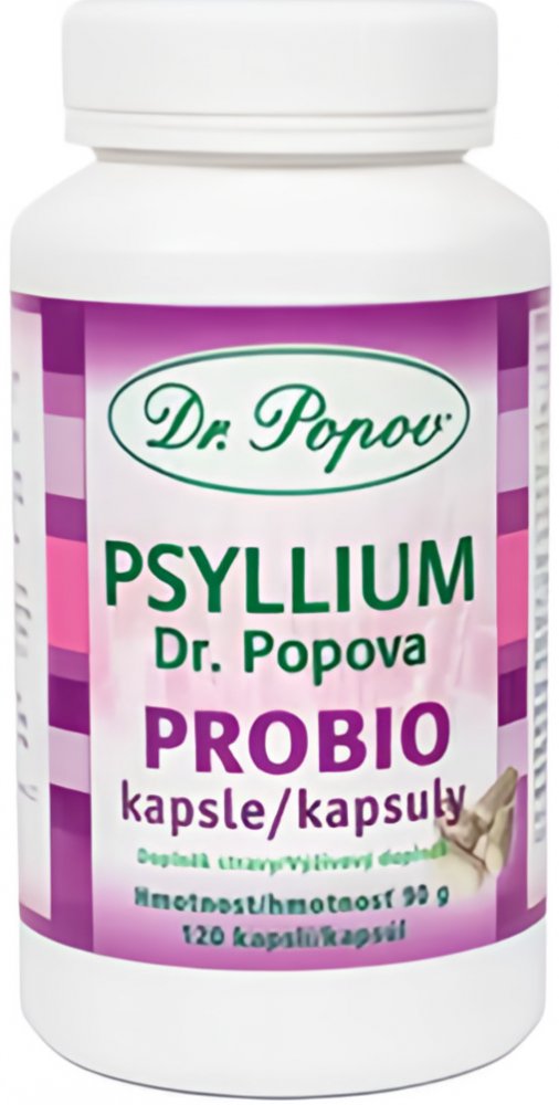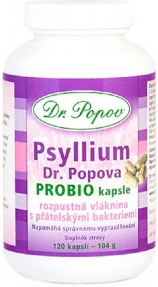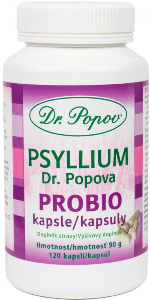 Dr. Popov Psyllium ProBio 120 kapslí kombinuje rozpustnou vlákninu psyllium a probiotické kultury (Lactobacillus acidophilus, Bifidobacterium longum). Tato dvojice pomáhá udržet pravidelné vyprazdňování, zdravou střevní mikroflóru a pocit lehčího břicha.