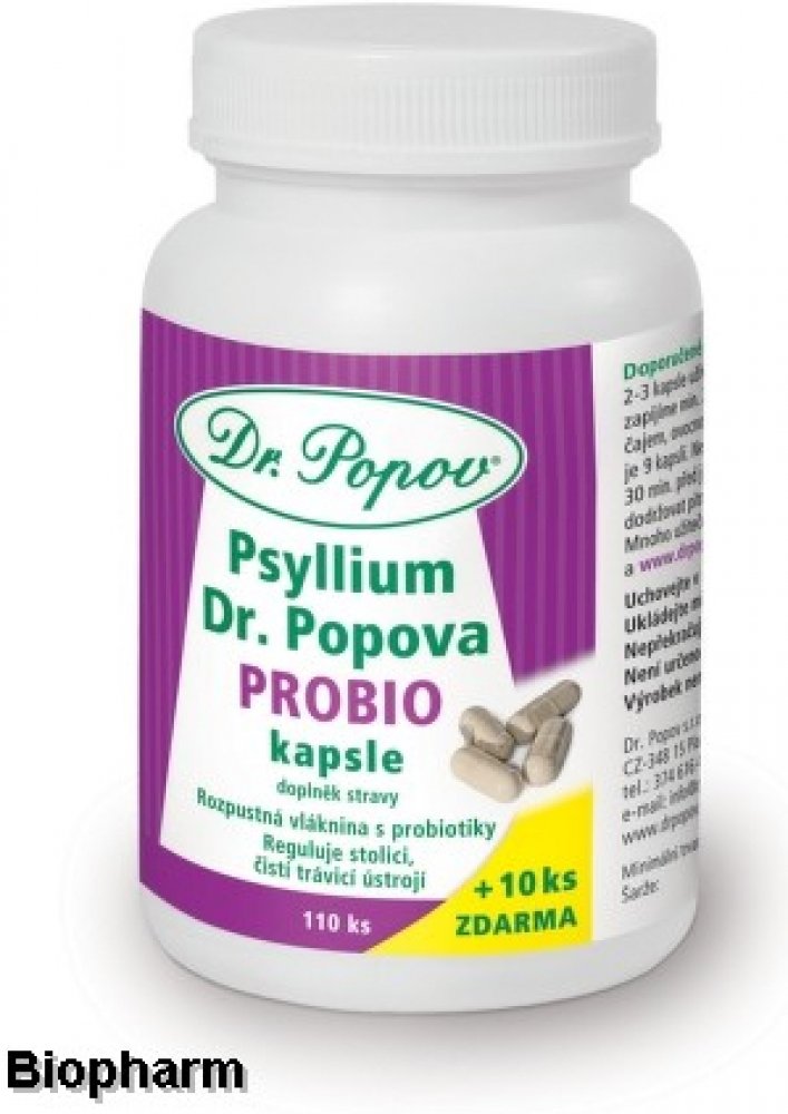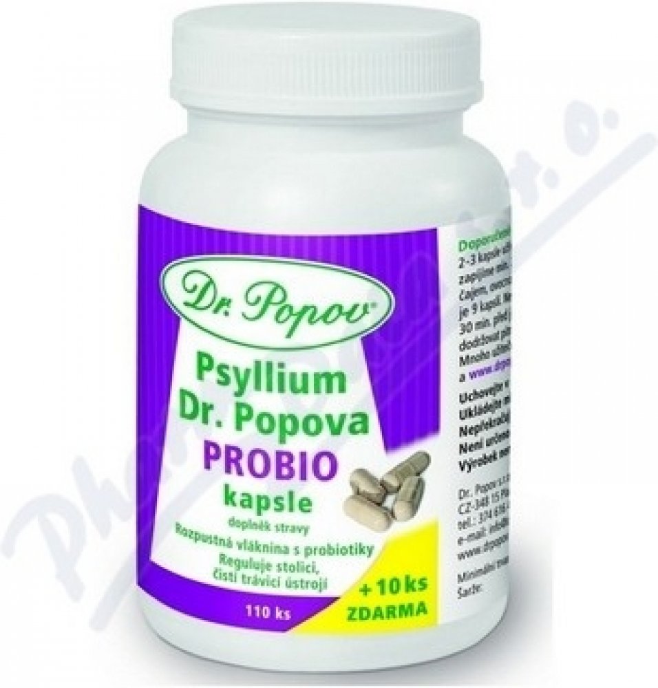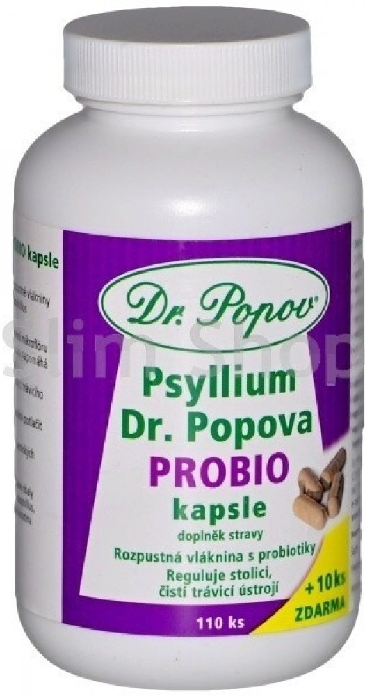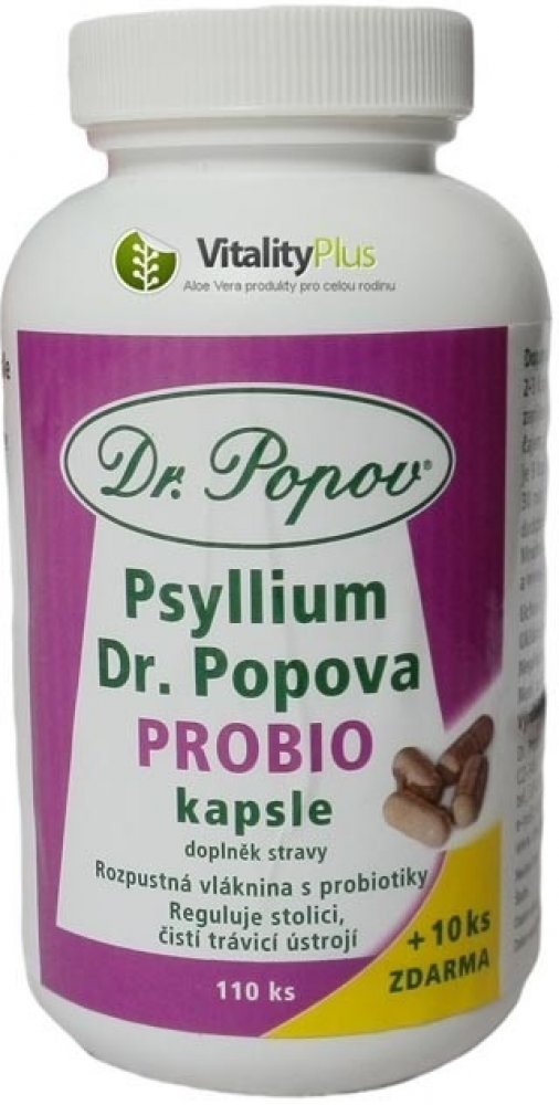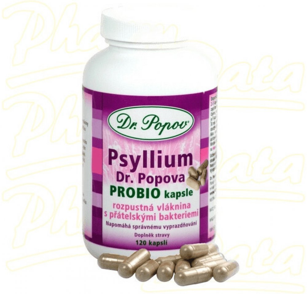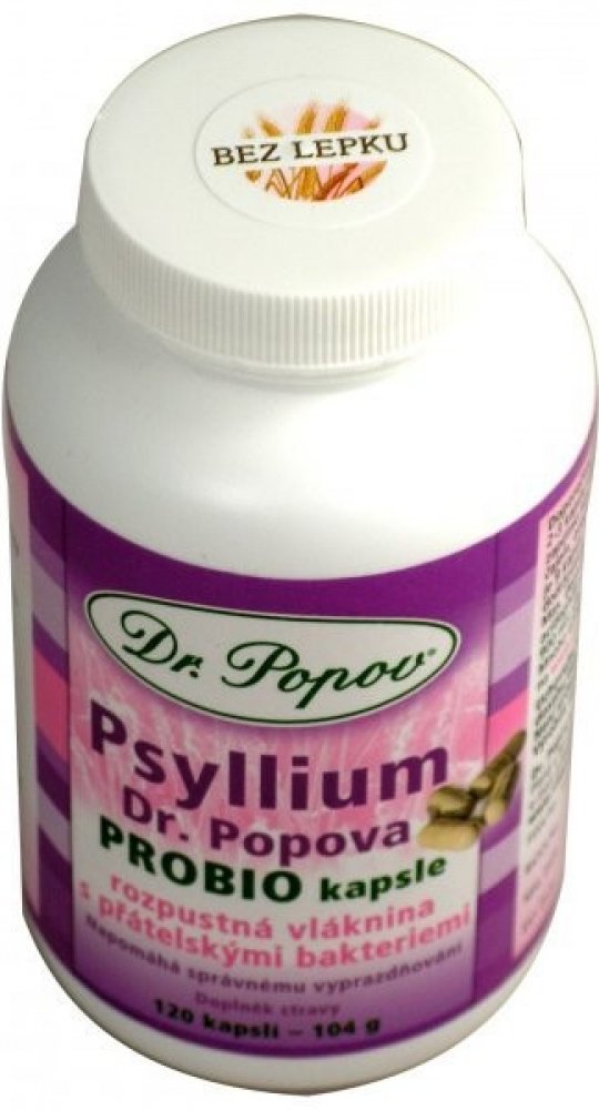 Dr. Popov Psyllium ProBio 120 kapslí kombinuje rozpustnou vlákninu psyllium a probiotické kultury (Lactobacillus acidophilus, Bifidobacterium longum). Tato dvojice pomáhá udržet pravidelné vyprazdňování, zdravou střevní mikroflóru a pocit lehčího břicha.
