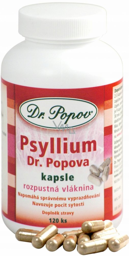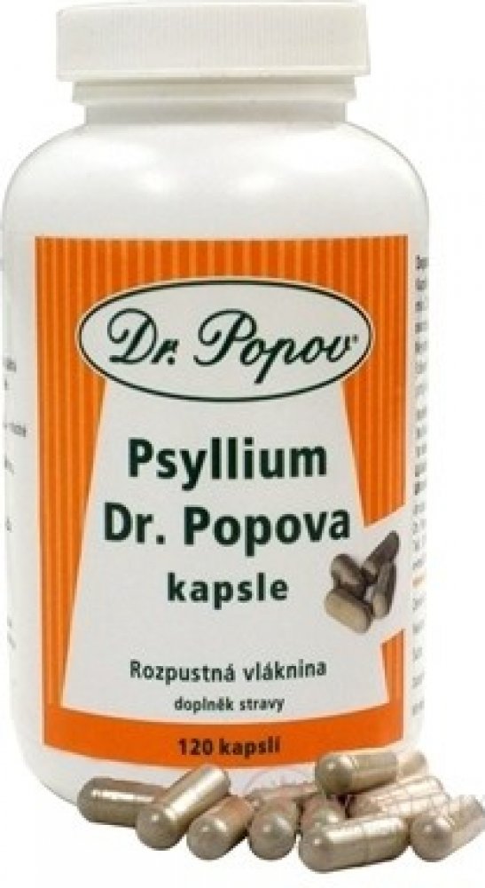 Dávkování :Užívání vlákniny Psyllium Dr. Popova v kapslích je velmi pohodlné. Stačí 2-3x denně užívat 2-3 kapsle a důkladně je zapít minimálně 250 ml vody nebo jiné tekutiny – bylinným čajem, ovocnou šťávou a podobně. Maximální denní dávka je 9 kapslí. Jedna kapsle obsahuje 750 mg Psyllia Dr. Popova.