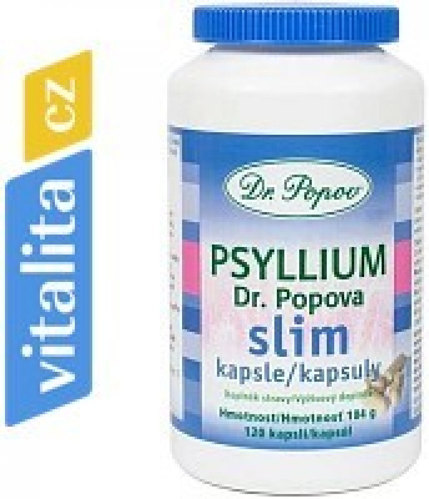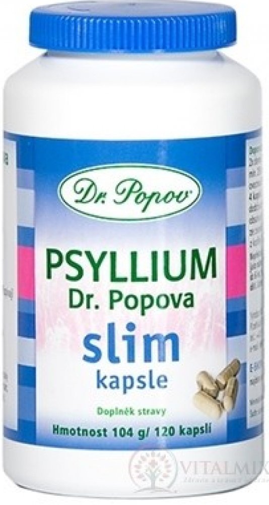 Upozornění: Vláknina psyllium je doplňkem stravy. Psyllium Dr. Popova není návykové. Je bez cukrů, chemických látek a barviv. Nepřekračujte doporučenou denní dávku vlákniny psyllium. Není určeno jako náhrada pestré stravy. Výrobek není určen pro děti do 6 let. Uchovejte v suchu při teplotě 5-25 °C. Ukládejte mimo dosah dětí. Balení 120 kapslí – 104 g. Jedna kapsle obsahuje 750 mg psyllia.