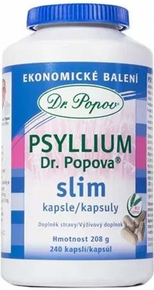 syllium Dr. Popova SLIM je špičková rozpustná vláknina získaná z osemení jitrocele indického (Plantago ovata). Její přirozenou vlastností je schopnost zvětšit několikanásobně svůj objem, díky čemuž pomáhá navodit pocit sytosti a přispívá k pravidelnosti trávení.