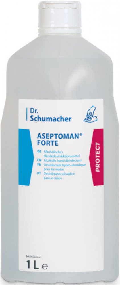 Dezinfekce na ruce Aseptoman Forte - 1000 ml: Virucidní dezinfekční prostředek na ruce na bázi ethanolu. Pečlivě vyvážená směs vysoce koncentrovaného ethanolu, změkčovadel a lipidových doplňovačů bez vůní a barviv zajišťuje optimální bezpečnost a kompatibilitu i pro citlivé uživatele. V rámci hygienické dezinfekce rukou je ASEPTOMAN® FORTE široce účinný proti norovirům, adenovirům, rotavirům a poliovirům, a to díky své vysoce účinné formulaci s 85% ethanolem. Osvědčený systém doplňování lipidů ASEPTOMAN® FORTE prokazatelně zvyšuje vlhkost pokožky, vyži
