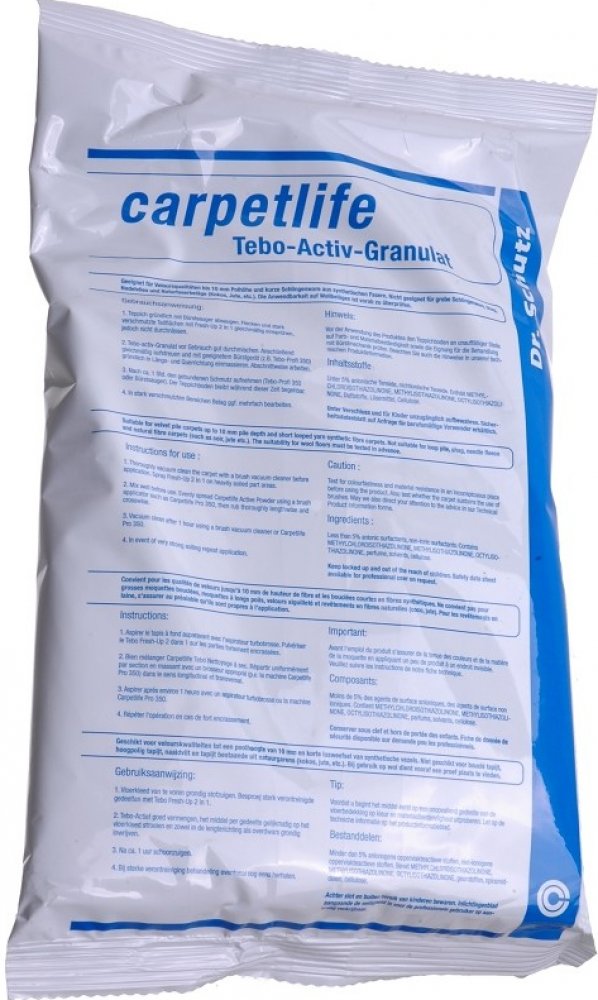 Tento jemně vlhký granulát skvěle rozpouští nečistoty a je vhodný pro intenzivní suché čištění textilních podlahovin. Ideální pro čištění koberců choulostivých na vlhkost, volně položených nebo napínaných koberců.Vhodné pro velurové koberce ze všech druhů syntetických vláken (např. volně kladené, napínané, při použití vodou rozpustných lepidel a zdvojených podlah) do výšky vlasu 10 mm a pro nízké smyčkové koberce. Žádné srážení nebo vlnění koberců. Podlaha není mokrá a je během čištění pochůzná. Zabraňuje také vzniku šedého závoje po čištění a zvýšenému opětnému ušpinění koberce. Barevná hloubka a svěžest koberce zůstane zachována. Díky optimálnímu rozdělení velikosti zrna téměř žádná tvorba prachu. Pro použití v domácnostech i pro profesionální čištění v objektech.Granulát díky optimalizaci zrna nevytváří téměř žádný prach.Postup použití:Koberec nejprve důkladně vysajte. Silně znečistěná místa předčistěte čitičem Fresh-Up 2v1.Po zaschnutí naneste jemnou rovnoměrnou vrstvu granulátu. Granulát důkladně zapracujte do koberce v podélném i příčném směru.