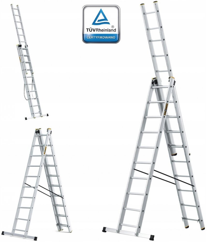 Trojdílný univerzální hliníkový žebřík je vyroben z kvalitního hliníku a je tak nepostradatelným pomocníkem ať už v zahradě, nebo při pracích kolem domu. Délka 10 příčkového žebříku je od 2,80 m do 6,20 m. Žebřík se dá rozložit do klasického i vysunutého tvaru A. Žebřík je vybaven protiskluzovými paticemi. Nosnost žebříku je 150 kg a je vhodný pro intenzivní používání.