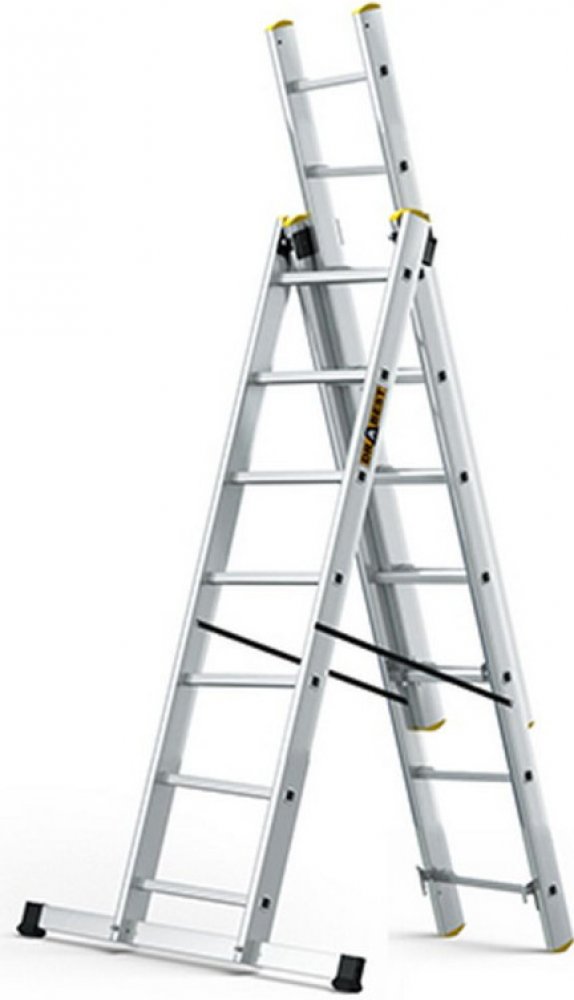 Profesionální víceúčelový žebřík DRABEST 3x7 příček lze sestavit jako štafle, výsuvný, opěrný nebo schodišťový žebřík. Žebřík nabízí široké možnosti uplatnění jak mezi profesionály, tak i kutily. Ilustrační foto, počet příček se liší dle typu žebříku.Nosným prvkem žebříku DRABEST 3x7 je tažený hliníkový profil 60x20 mm, do kterého jsou nalisovány příčky s rozměry 28x28 mm. Masivní konstrukce spolu s robustně nalisovanými příčkami dává žebříku mimořádnou tuhost, odolnost a dlouhou životnost. Špičkové stability a bezpečnosti je dosaženo širokým stabilizátorem s protiskluzovými patkami. Použitý stabilizátor dovoluje bezpečné výškové práce i na horším či nerovném terénu.Třídílné PROFI žebříky DRABEST jsou kvalitní, spolehlivé a bezpečné výrobky pro profesionální i domácí použití. Žebříky jsou vyráběny v EU a splňují přísné evropské normy. Mezi další přednosti patří široký výběr originálního příslušenství jako je např. pracovní plošina, manipulační kolečka, hák na vědro, střešní hák a další doplňky. Hlavní přednosti: profi kvalitaširoké možnosti použitíprotiskluzové prvkycertifikovaný výrobekvyrobeno v EUširoký výběr originálního příslušenství Technické parametry: počet příček: 3 x 7max. pracovní výška: 5,19 mdélka: 1,85 - 4,23 m (složený - rozložený)stabilizační základna: cca 75 cmnosnost: 150 kgmateriál: tažený hliníkový profil 60x20 mmcertifikace: EN 131 Technické parametry ke stažení ve formátu pdf zde.