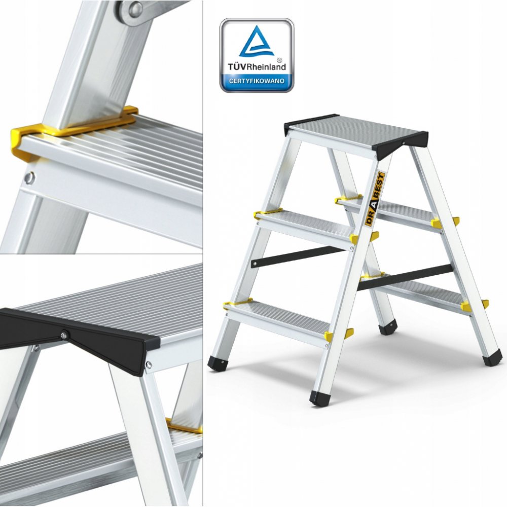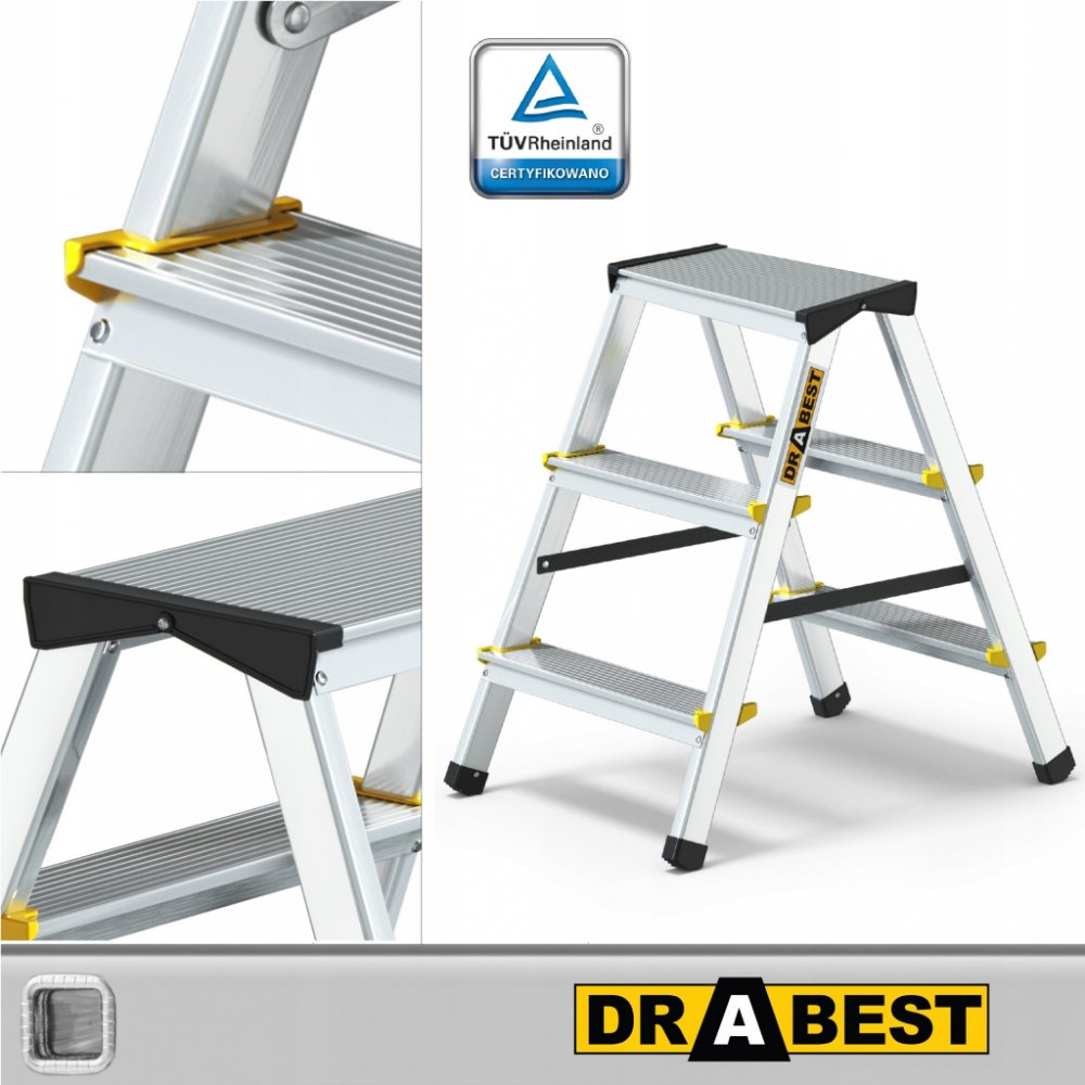 Hliníkové schůdky DRABEST DD3 PRO jsou vhodné pro každodenní intenzivní používání v průmyslu, na stavbě a dalších náročných oborech vyžadujících nekompromisní kvalitu. Schůdky splňují přísné bezpečností normy dle EN 131 a jsou certifikovány německou zkušebnou TÜV Rheinland. Nosnost číní 150 kg.