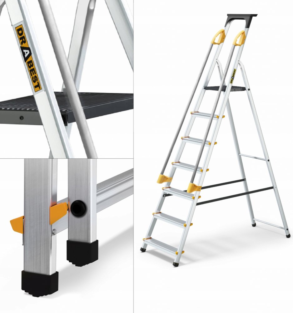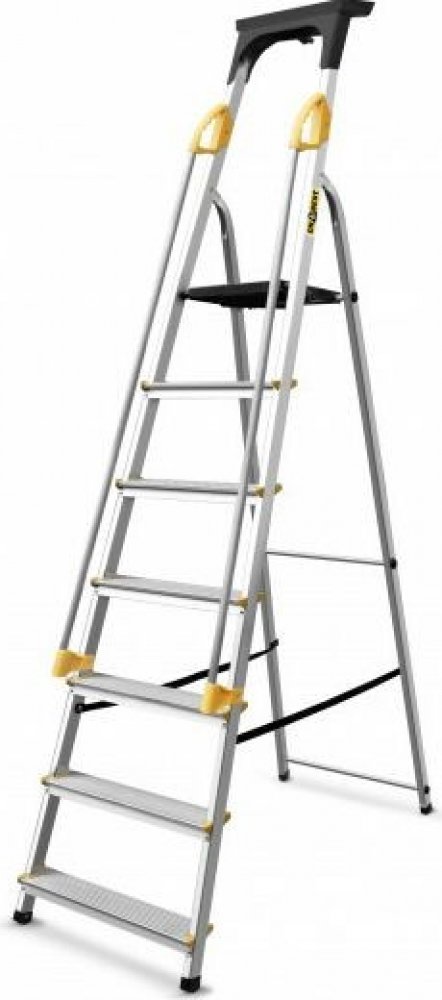 Pevná, kompaktní konstrukce s nejvyššími bezpečnostními parametry. Žebřík má pohodlná ergonomická madla, která zvyšují jeho stabilitu a zvyšují komfort používání při každodenní práci. Vysoká nosnost až 150 kg. Skvěle se bude hodit pro práci v domácnostech, ale široké uplatnění najde iv malých a středních podnicích či úklidových a renovačních firmách. Pevné výztuhy a široké schůdky s protiskluzovými zářezy. Žebřík je upevněn na pevných, protiskluzových plastových nožičkách. Lehká a skladná konstrukce vyrobená z hliníku. Výrobek je v souladu s normou EN 131. Technické parametry: Materiál : hliník Typ spojení příček: nýtování Počet schodů: 7 Výška k platformě: 0,43 m Maximální nosnost: 150 kg A Pracovní výška: 3,4 m B Výška k plošině: 1,4 m C Šířka žebříku: 0,5 m D Délka složeného žebříku: 2,15 m G Tloušťka složeného žebříku: 0,115 m Tloušťka s madly: 0,2 m Hmotnost: 6,9 kg Vstup: jednostranný Vybavení: polička a zábradlí
