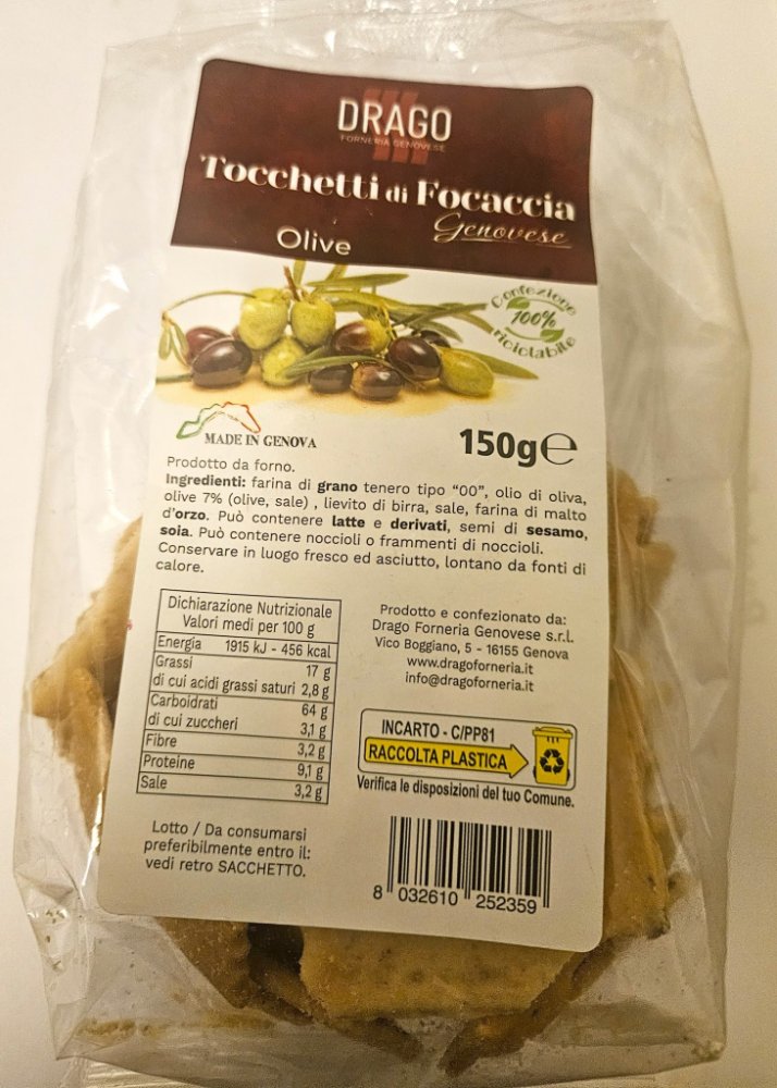 Křupavé kousky focaccie s olivami od Draga jsou autentickou italskou lahůdkou. Jsou vyrobeny z kvalitních surovin a jsou ideální pro gurmánskou přestávku, jako předkrm nebo jako doplněk k polévkám a čerstvým salátům . Jejich bohatá chuť a křupavá textura se skvěle hodí k vyzrálým sýrům , uzeným masům nebo sklence šumivého bílého vína . Pozdvihněte svá setkání a překvapte své hosty nádechem Středomoří. Objednejte si hned teď a přineste si na stůl dokonalost italské tradice!