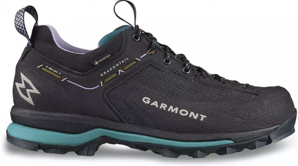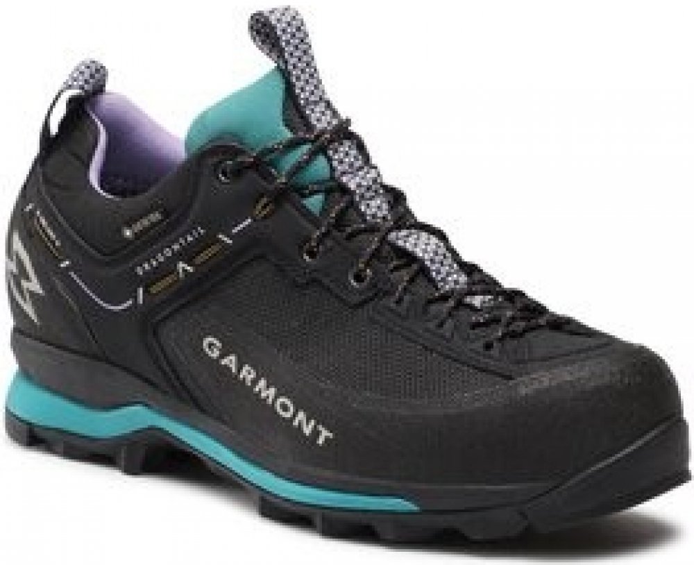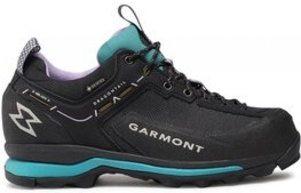 Dámské nepromokavé nízké trekové boty vhodné na ferraty a jako nástupové boty. Svršek syntetický (oděruodolný nylon + TPU), membrána Gore-tex Extended Comfort, podrážka Garmont GTF Diamante Rubber - má vzorek, který zvládne strmé stoupání i prudký sestup, pod špičkou disponuje lezeckou zónou pro skalní výstupy , konstrukce A.D.D. Barva černá v kombinaci s bílými, zelenými, žlutými a lila prvky. Re...